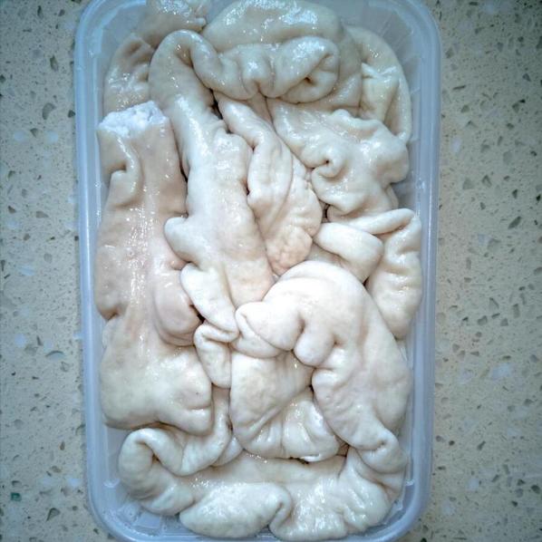 1、準備一條新鮮的豬大腸,我一般是提早去菜市場上,去肉攤上挑選一番,基本都是當天的,新鮮程度很高。