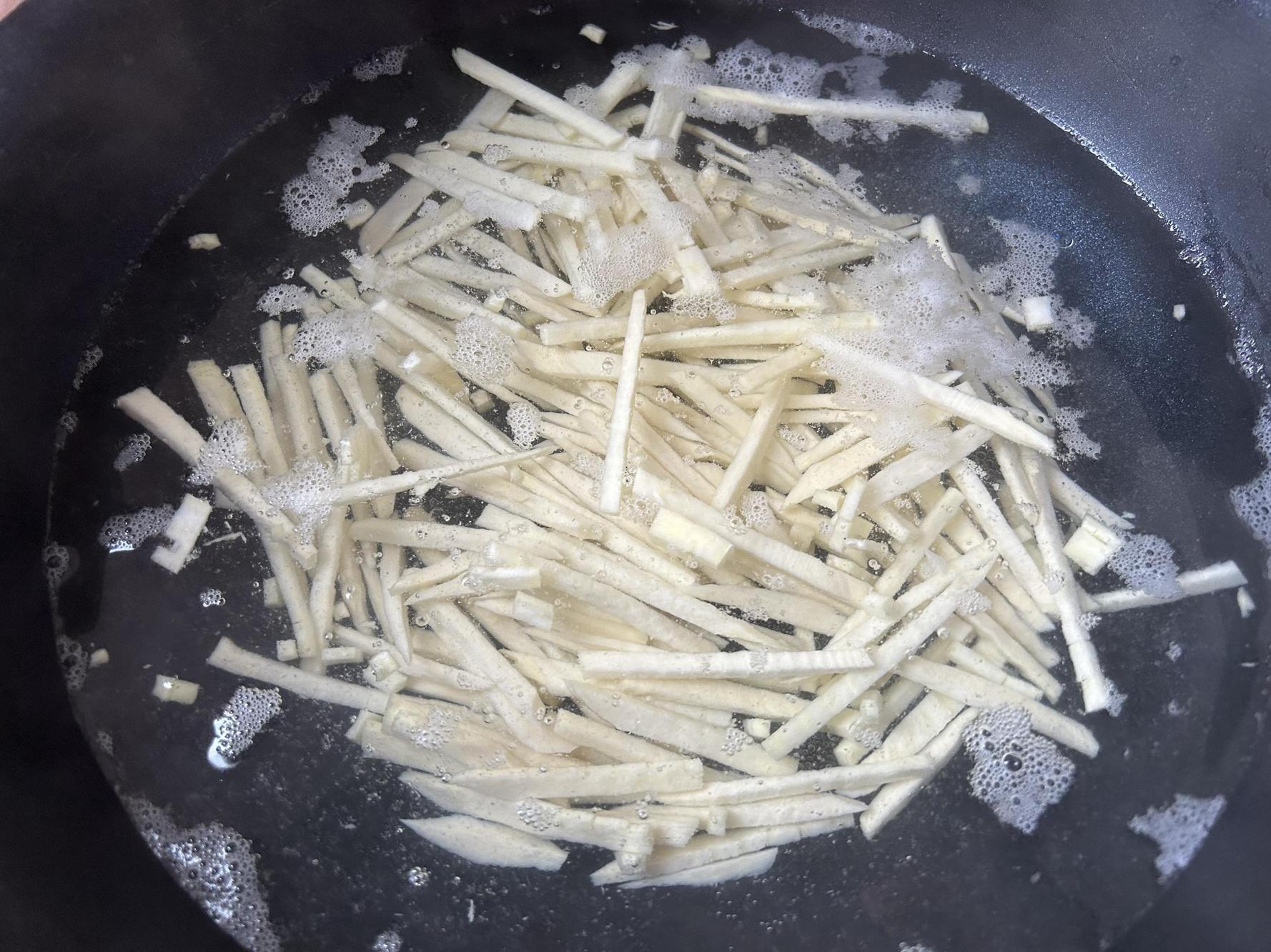 這裏給大家分享一下冬筍焯水的方法:冬筍剝掉筍殼,切成大塊、薄片或者切絲,放到燒開的鹽水中,大火煮3-5分鐘,撈出來清洗乾淨。