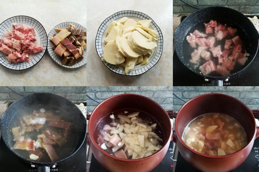 做法:1.排骨剁成小塊,火腿肉切薄,冬筍去殼切成薄片,放到燒開的水裏,大火煮5分鐘,撈出來清洗乾淨。