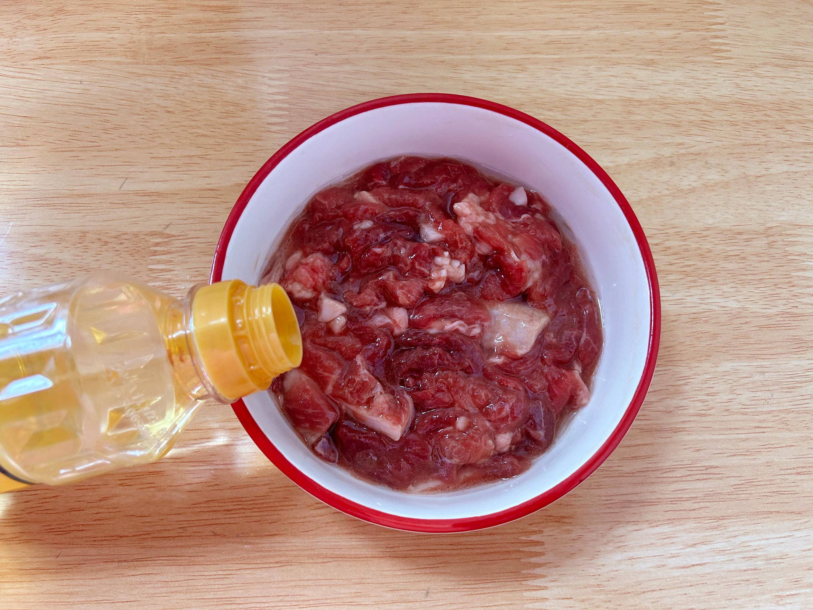 加入食用油翻拌均勻,鎖住羊肉中的水分。不少人在家醃製羊肉,都會忘了加油縮水,下鍋就容易粘連在一起。