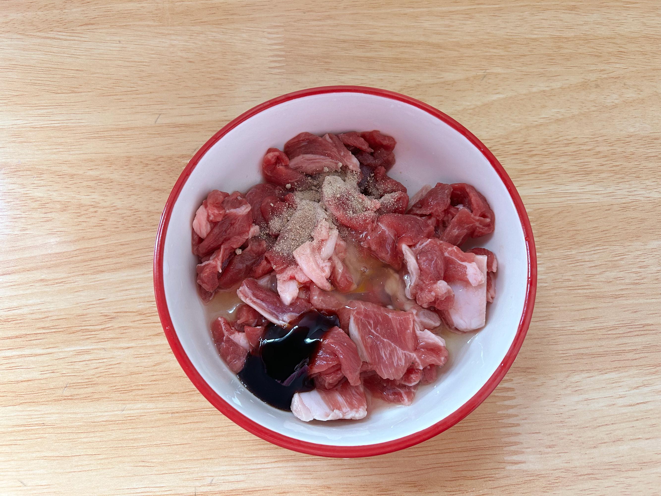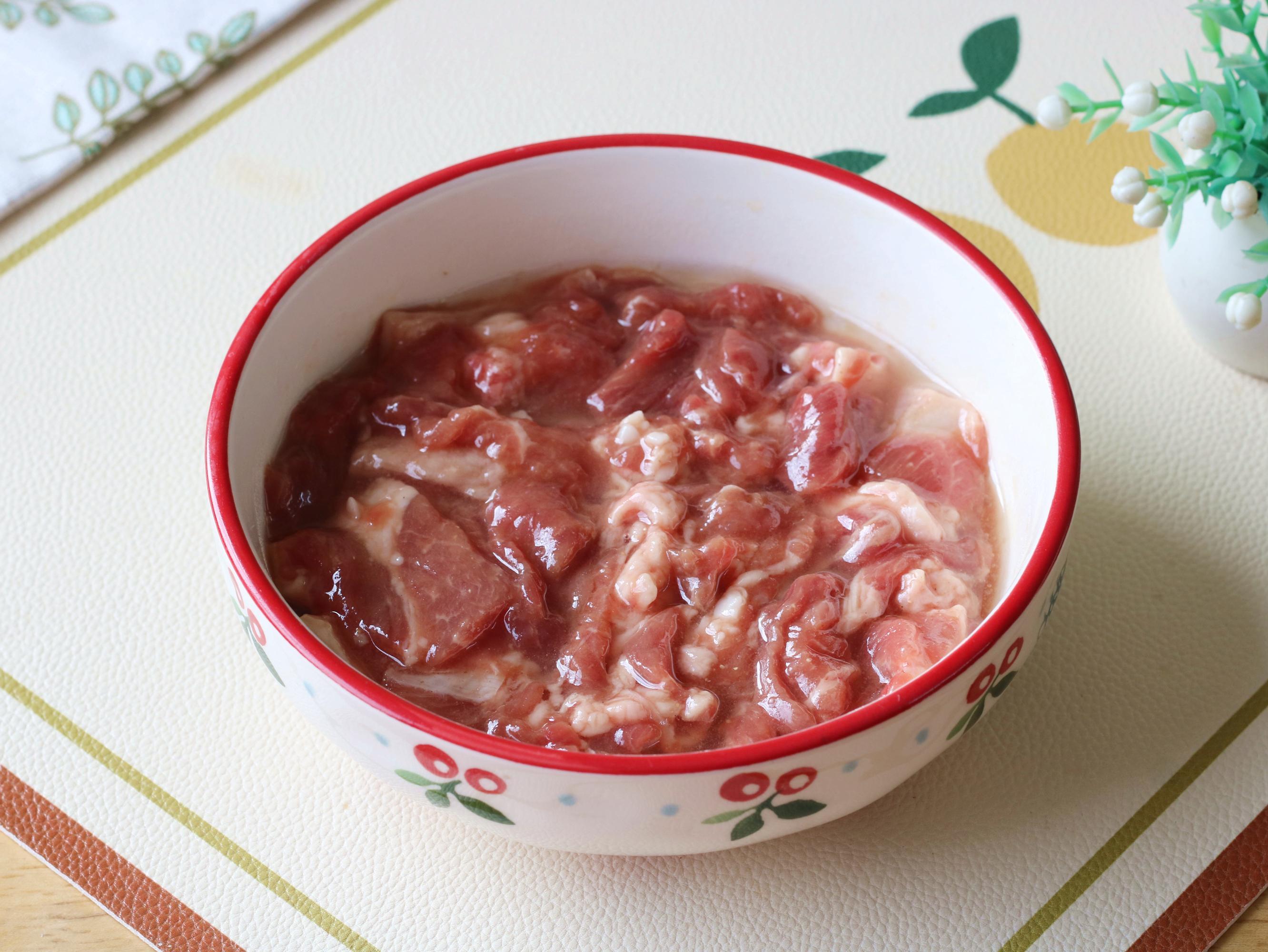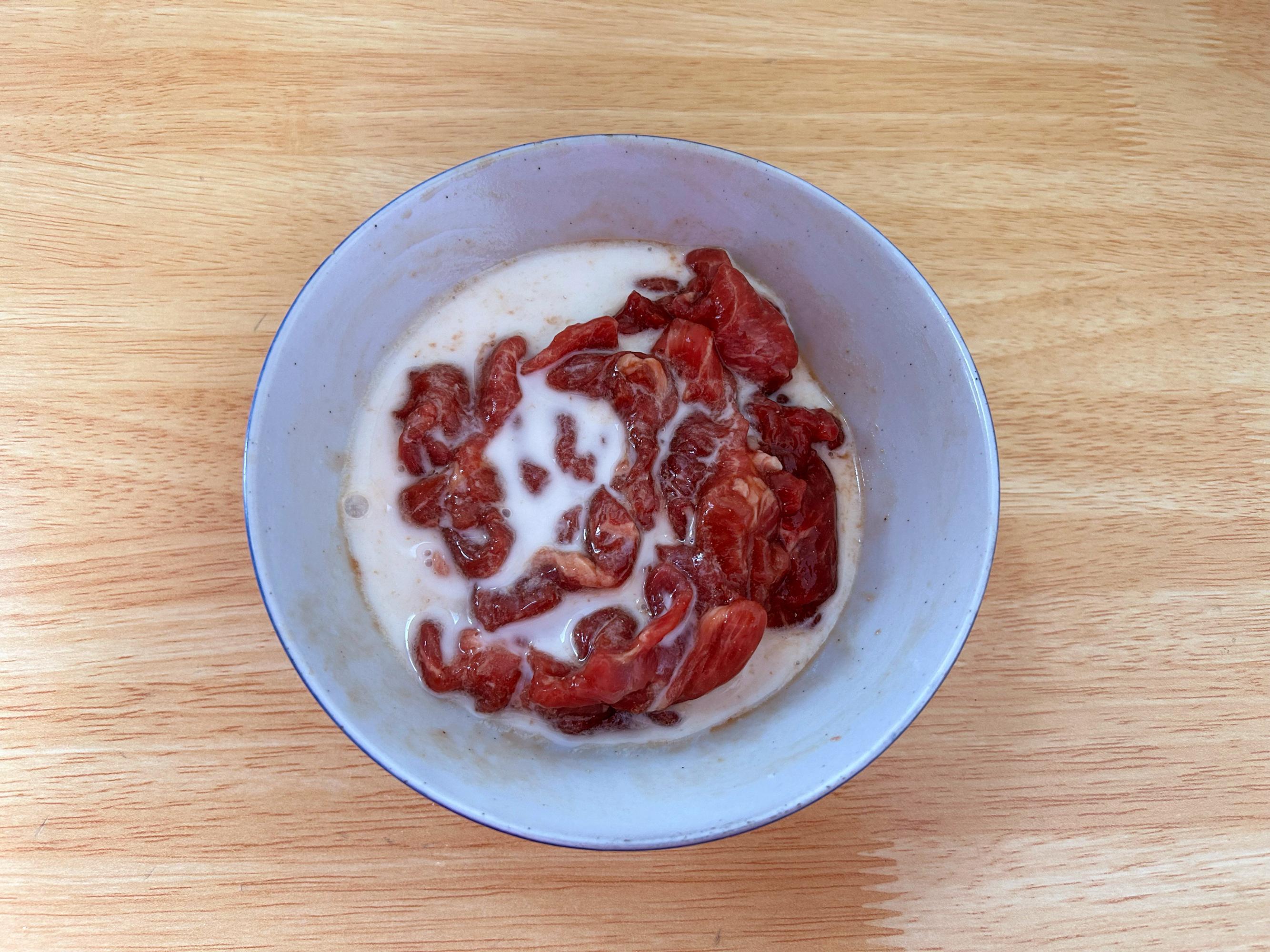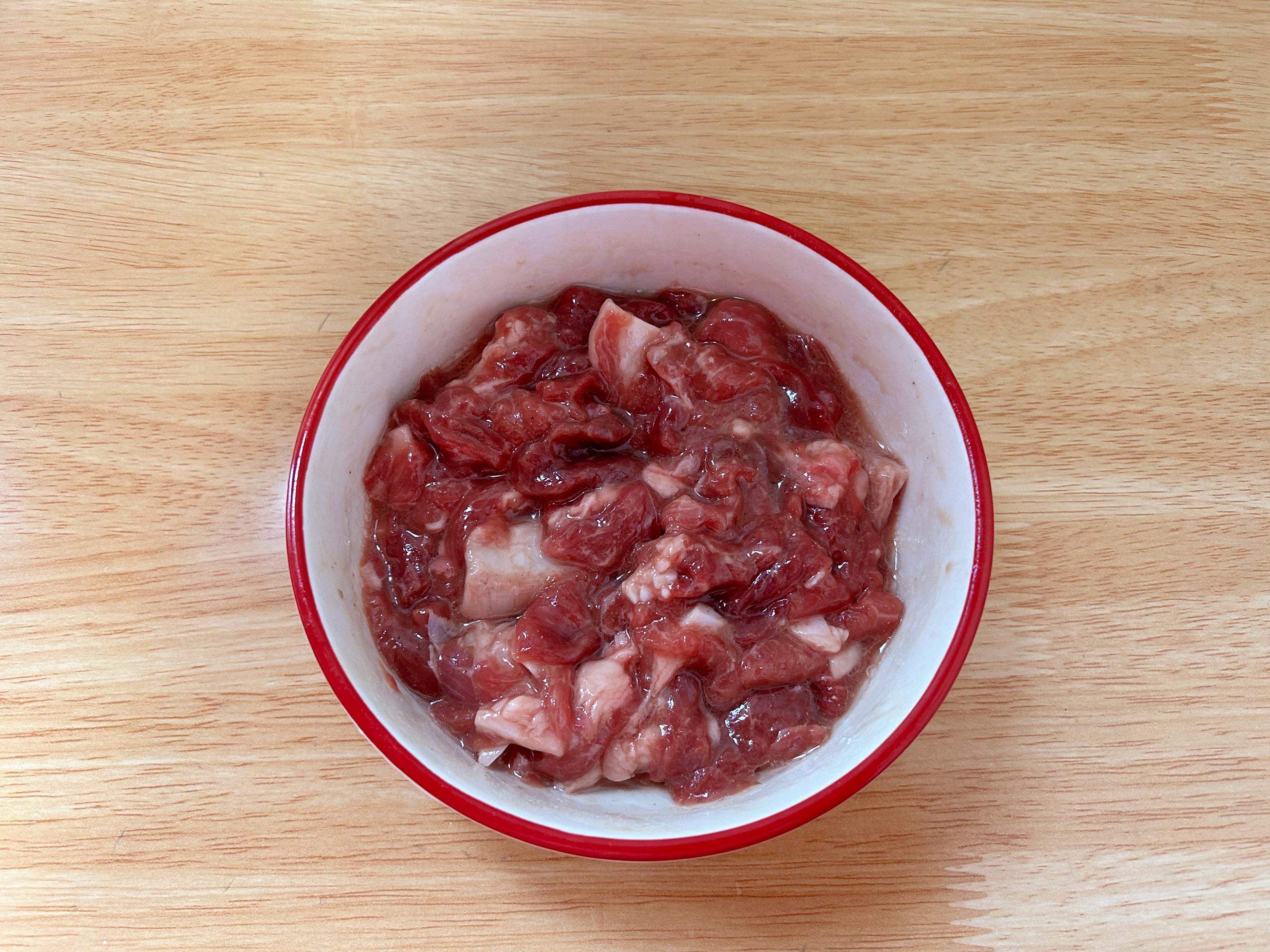 1勺玉米澱粉加3勺水混合成水澱粉,倒入裝有羊肉的碗裏,用筷子攪拌到羊肉吸收掉水澱粉。我這次忘了拍圖,用的上次小炒羊肉的醃肉圖片。
