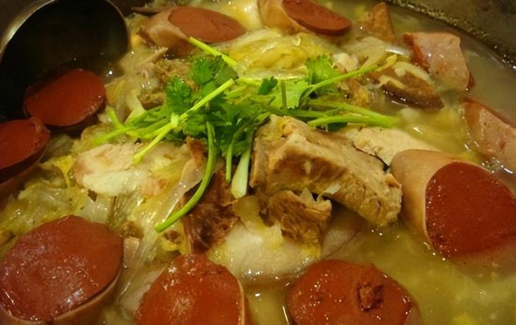 殺豬菜則是東北的特色菜,內容豐富,除了有酸菜,最主要的還有五花肉,經過酸菜的洗禮,這五花肉入口即化,肥而不膩,這的特別的好喫,最主要的精華在於四周擺上一圈血腸,經過酸菜燉出的血腸,那真是別有一番滋味在心頭,而且這道菜的關鍵點是要趁熱喫,店家一般都會現場加熱,給人以回家的感覺。