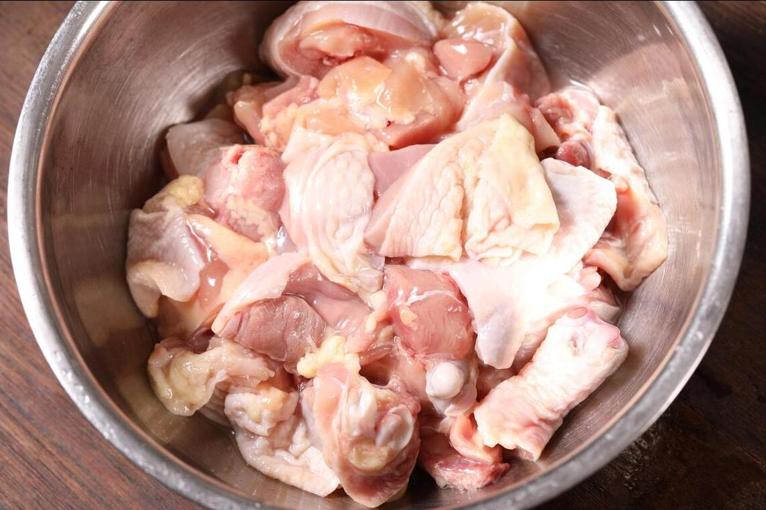 2、拿回來以後,不需要清洗,更不需要焯水,準備一個大點的盆,把雞肉直接倒進去,然後往裏面倒上適量的清水。將其放在一旁,靜置40分鐘左右的時間,有時間的話1個小時也是可以的。