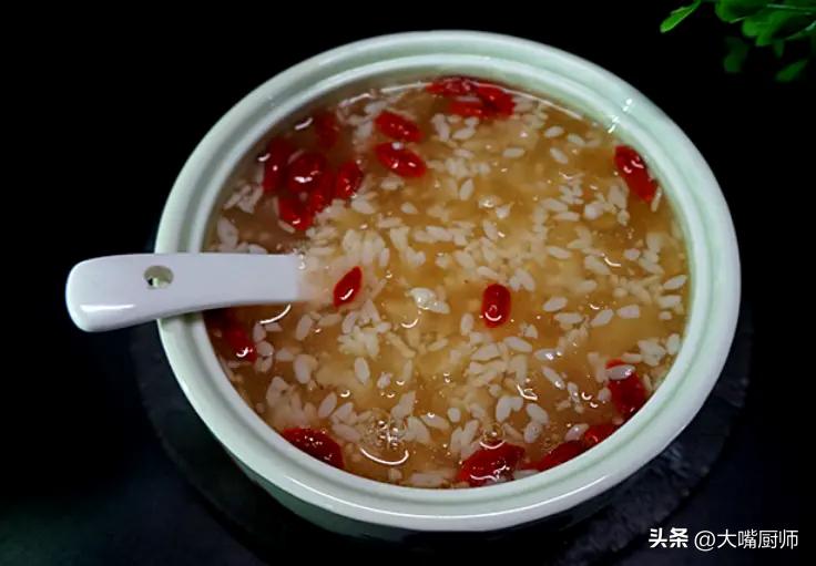 2、銀耳煮好後加入一盒酒釀,超市裏有賣的,用勺子攪拌均勻,根據個人口味加入冰糖,再加入枸杞,繼續煮5分鐘即可。