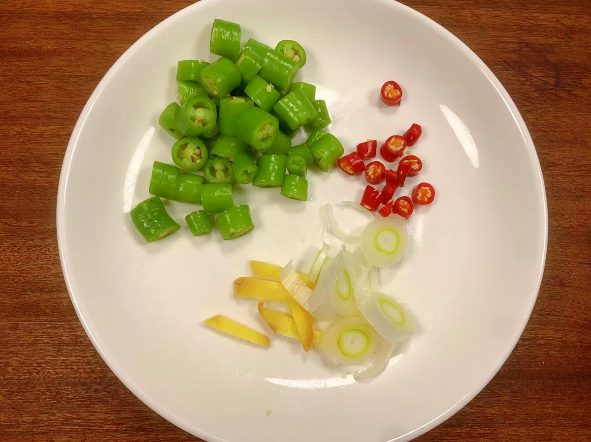 【辣炒魔芋】 所準備的食材有:魔芋、線椒、小米辣、蔥姜、鹽、味極鮮、食用油、蠔油