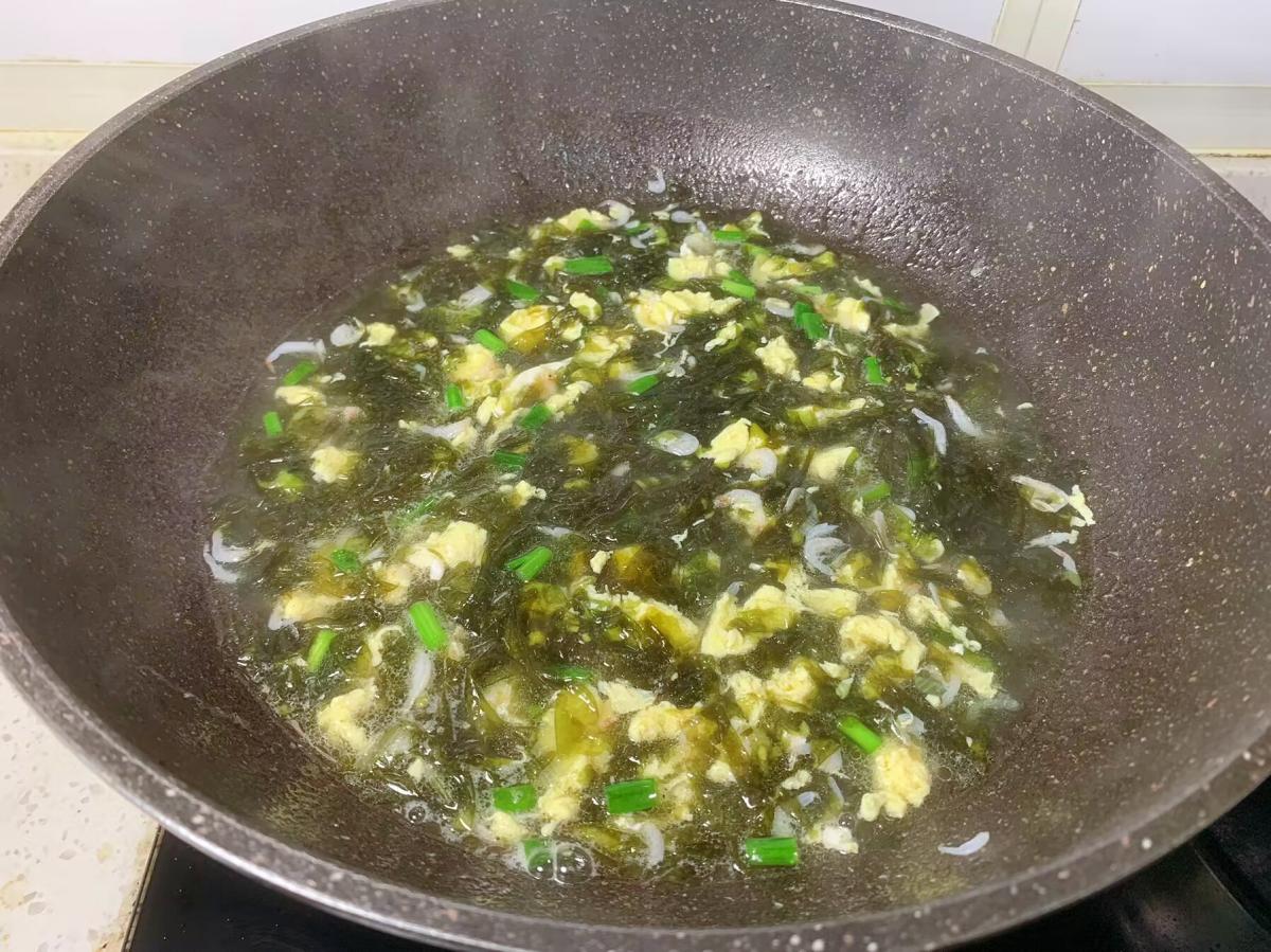 裝盤: 待蛋花凝結成型後,撒上香蔥末,即可關火。將湯倒入碗中,一碗香噴噴的紫菜蛋花湯就完成啦!
