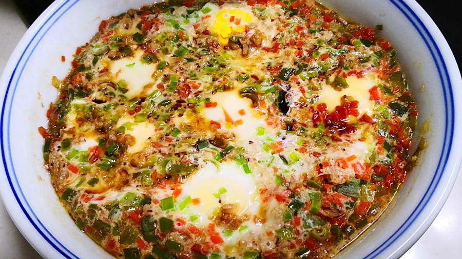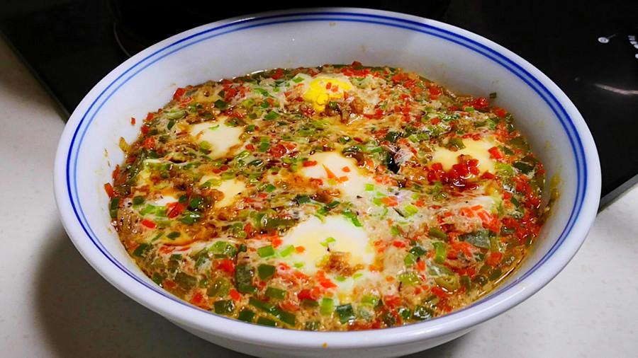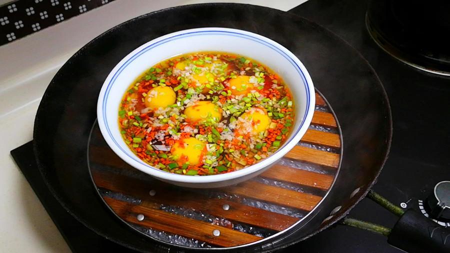 5.大約蒸二十分鐘左右,雞蛋就差不多蒸熟了,關火後燜2分鐘,然後開鍋取出,上面再澆上一點味極鮮或蒸魚豉油,就可以開喫了,用勺子挖着喫,口感香嫩爽滑,一口一口根本停不下嘴,太過癮了!