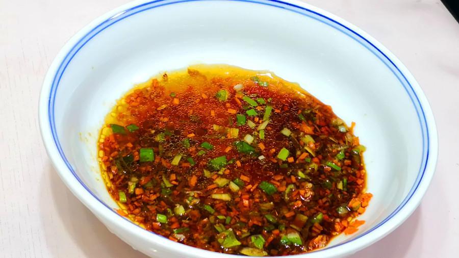 2.然後準備配料:取一把蝦皮放入碗中,加入適量溫水浸泡片刻,再用清水多衝洗幾遍,可以減輕蝦皮的鹹腥味;再準備適量的胡蘿蔔丁和小蔥花。