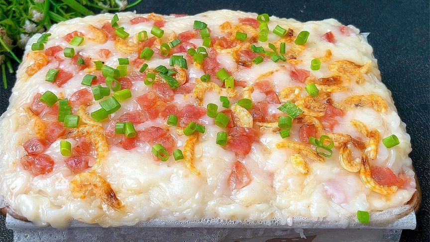 2、模具鋪一張油紙,倒入蘿蔔糊整理平整,把剩下的臘腸鋪在上面壓一壓,放入蒸鍋裏,水開上去,中火蒸45分鐘,蘿蔔糕就做好了,放涼後切小塊,也可以把它炸至八面金黃。