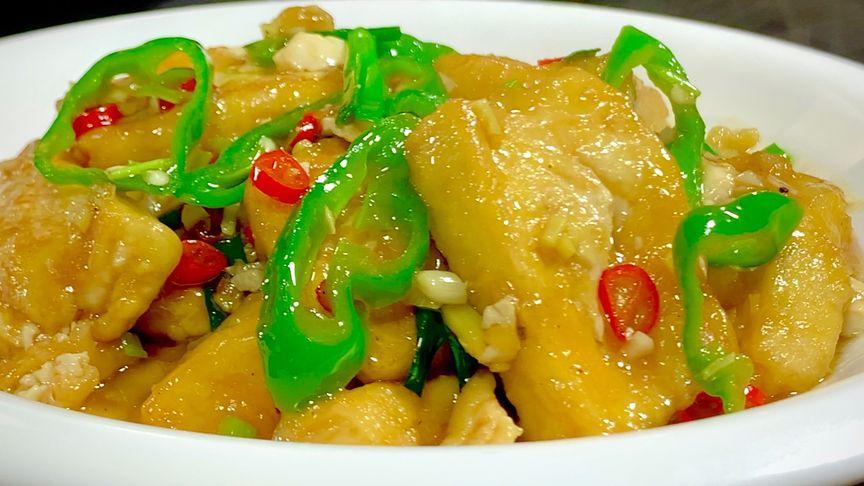 2、豆腐裹上雞蛋液,然後再裹滿着澱粉,放到油鍋裏煎至兩面金黃,放到碟子裏面備用,油熱之後把姜蒜末、小米辣炒香以後,再把豆腐,料汁一起加進來,燜個一分鐘,就做好了。