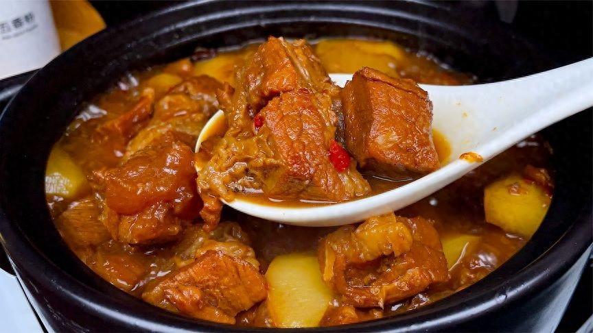 2、油熱後放入一勺郫鮮豆瓣醬、黃豆醬炒出紅油,放入蔥姜和大料,倒入牛肉塊,開大火爆炒,倒入一點老抽、料酒,倒入熱水。燒開後倒入高壓鍋裏壓21分鐘,再加入一勺食鹽,冰糖,壓五分鐘就可以出鍋了,燉牛肉就做好了。
