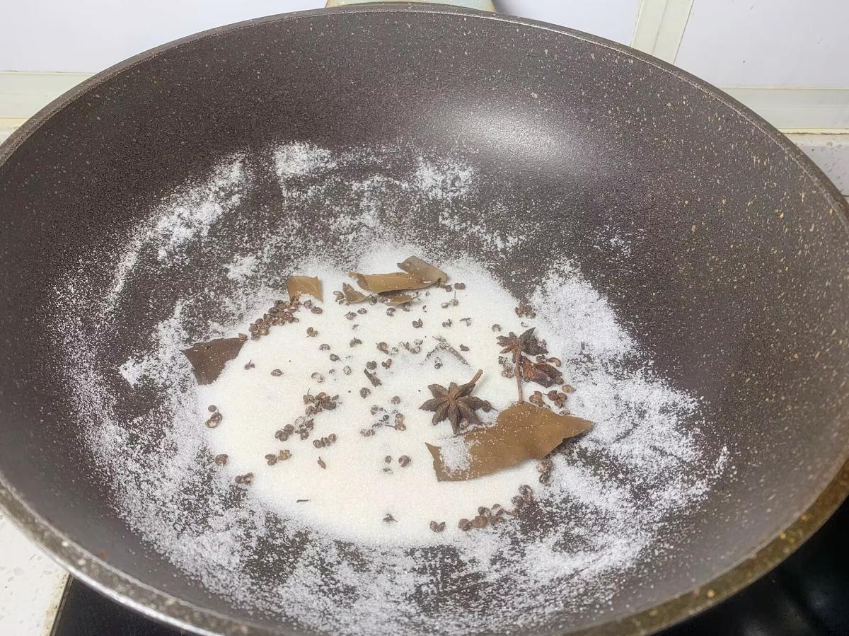 2、鍋中倒入一碗鹽、1小把花椒粒、幾片香葉、八角,用小火炒,同時用鏟子不停地攪拌,炒至食鹽顏色微黃,關火後晾涼,這樣做的鹽香味十足,醃魚肉特好喫。