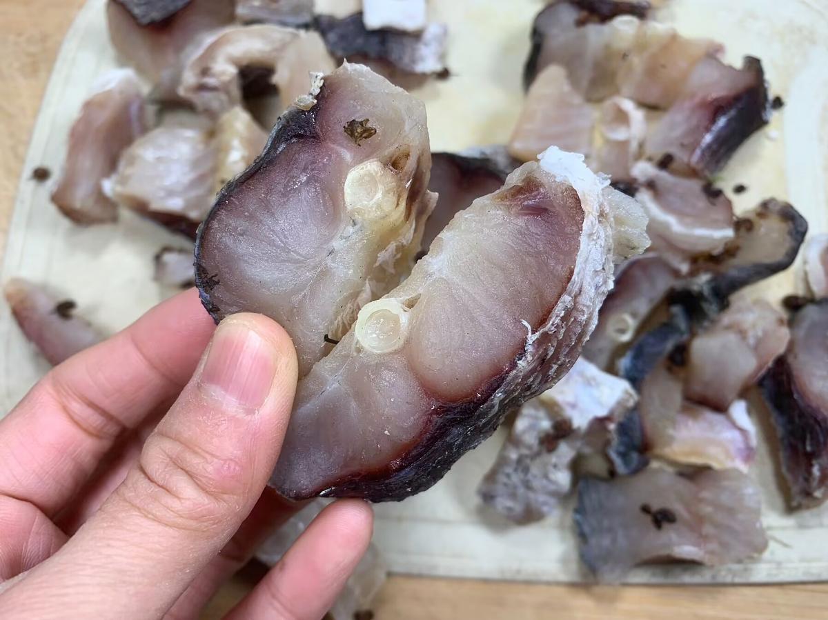 6、風乾好的魚乾表面會有一層鹽霜,並且魚肉中一點水分都沒有了,摸上去硬邦邦的感覺,就說明已經曬好了。