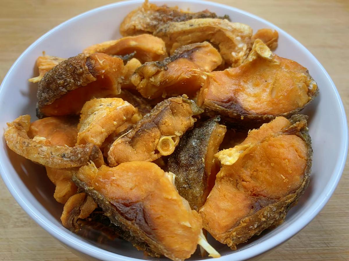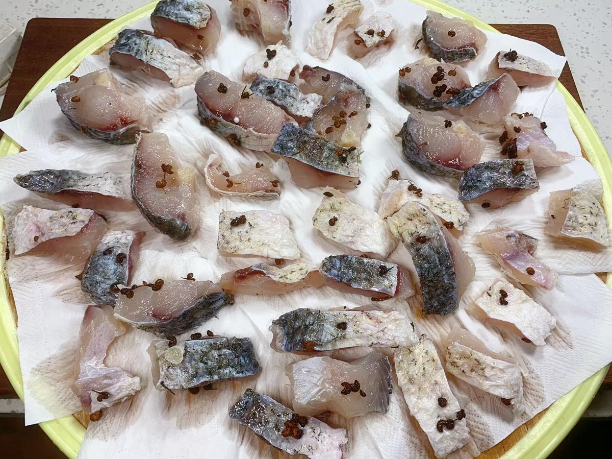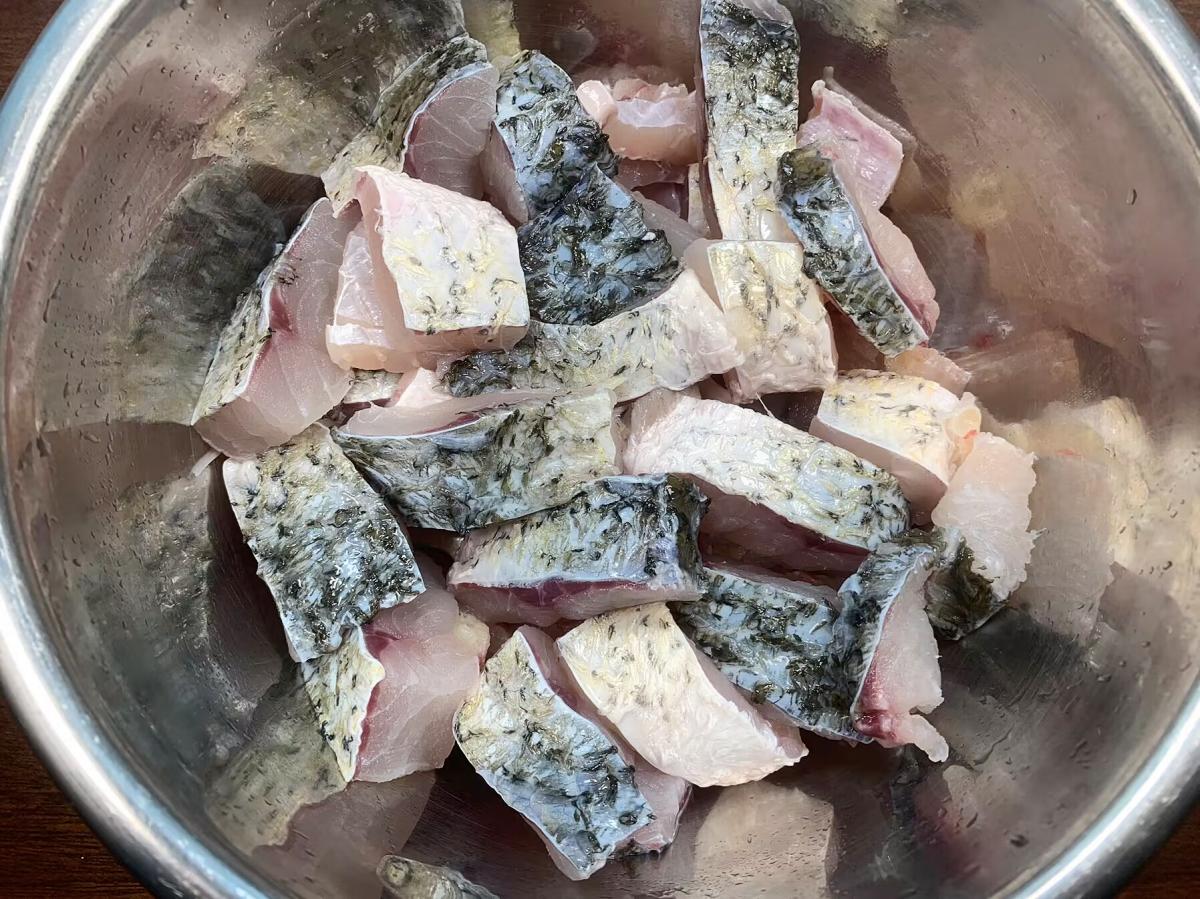 具體做法:1、準備幾條現宰的草魚,一次可以多做一些,不然不夠喫,取出內臟後清洗一下肚囊,刮掉魚鱗,將草魚一分爲二,再充分清洗一下,然後把魚肉剁成大小均勻的小塊,用廚房紙巾把魚塊表面的水分吸一下,保證魚肉表面乾燥。