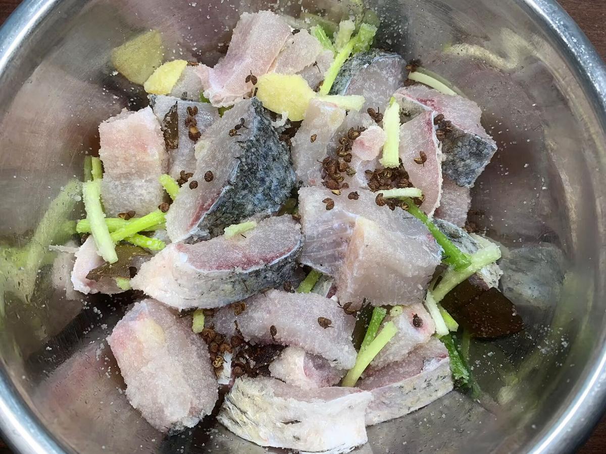 3、把晾涼的食鹽連調料品都倒入魚塊內,再放一些蔥段、薑片,下手拌均勻,醃上24小時。