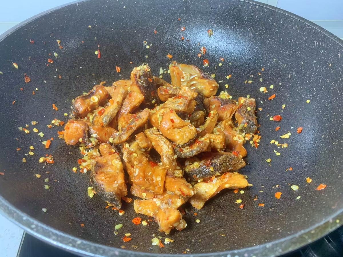 另起鍋燒油,放入薑末、幹辣椒炒香,關火後倒入草魚乾不停地翻拌,使魚乾均勻裹滿幹辣椒碎,喫起來口感會更好。香辣可口,肉質緊實有嚼勁,下酒又下飯,也可以當作饞嘴小零食,特解饞。