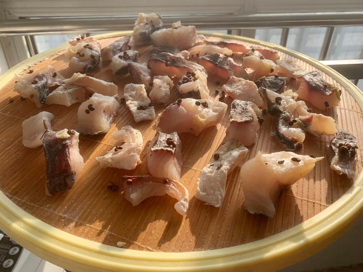 5、晾曬的過程中要翻一下面,這樣曬得均勻一些,下圖是曬一天的效果,明顯魚肉內的水分抽乾很多,繼續風乾2天。