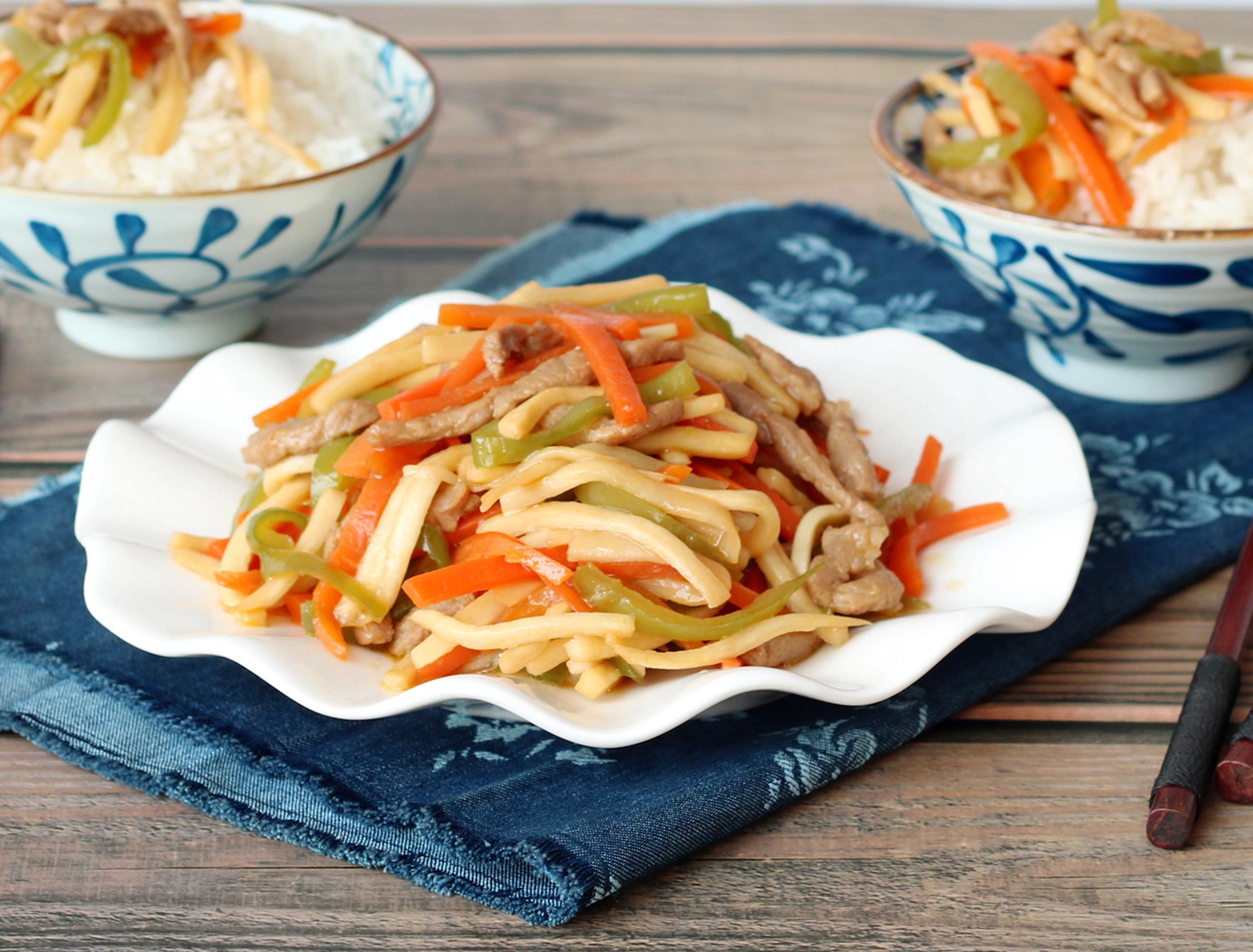 食材:豬肉、茭白、青椒、胡蘿蔔、玉米澱粉、食用油、生抽、鹽