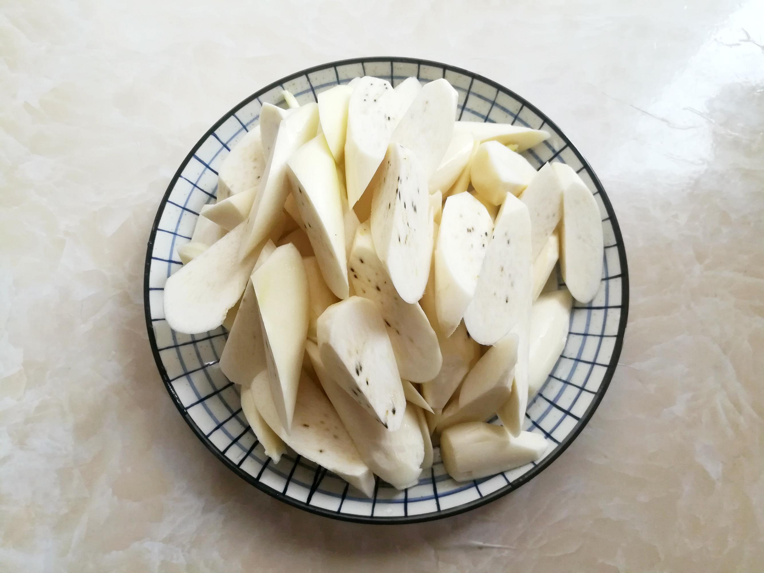 2.茭白切成滾刀塊。最近買到的這種茭白切開以後有黑點,一開始以爲是壞了。後來詢問了做營養師朋友,她告訴我,這些黑點是寄生在茭白體內的菰黑粉菌孢子,不僅可以食用,還含有相當豐富的人體必需的賴氨酸。這些小黑點正是茭白可以抗骨質疏鬆的重點,是一種名爲“菰黑粉菌”的真菌類,對於一些代謝有正面的效果,可以延緩骨質的老化。