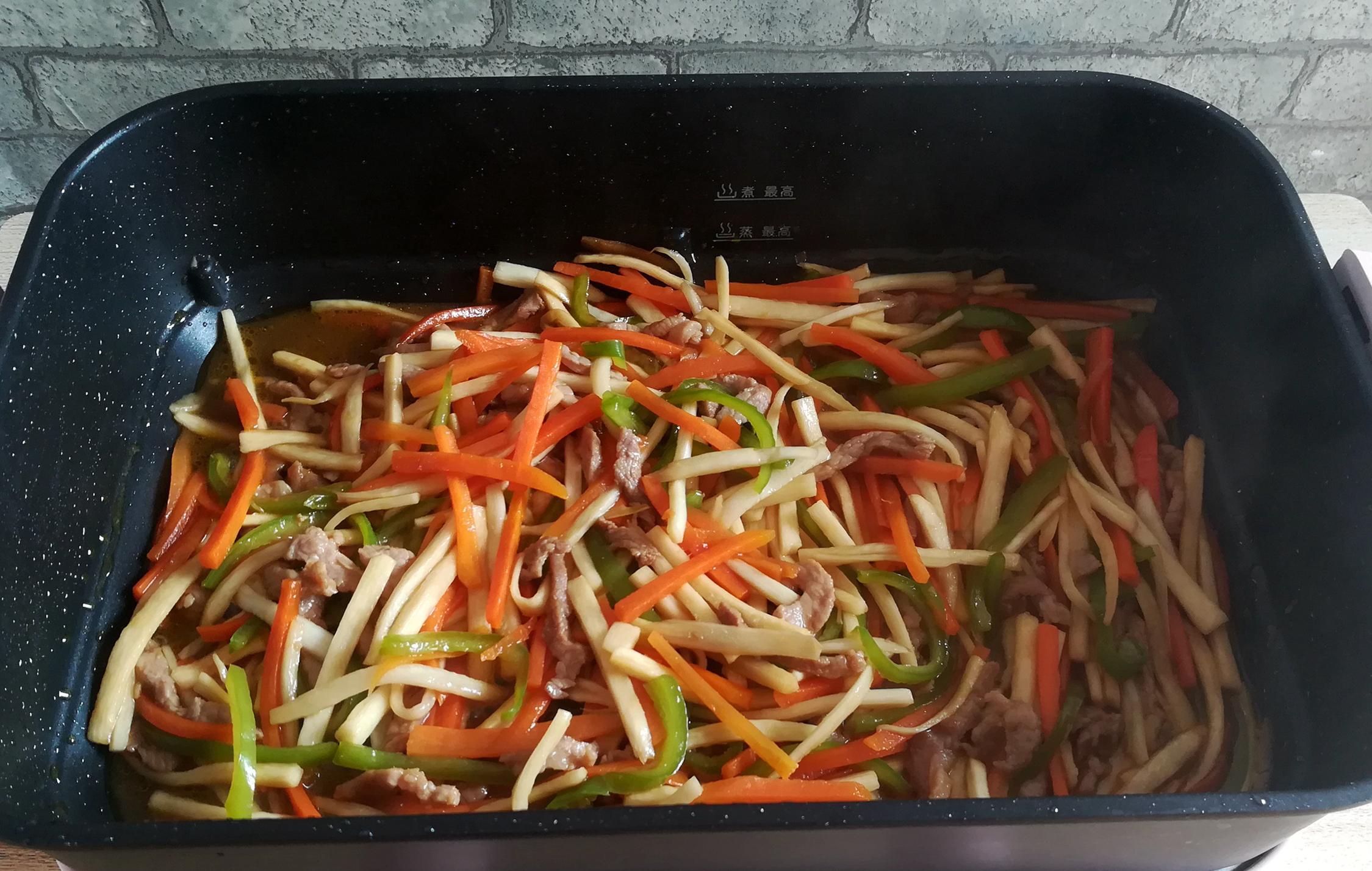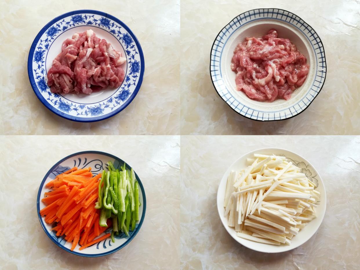 做法:1.豬肉清洗乾淨,切成細絲,加入玉米澱粉和食用油醃製10分鐘。