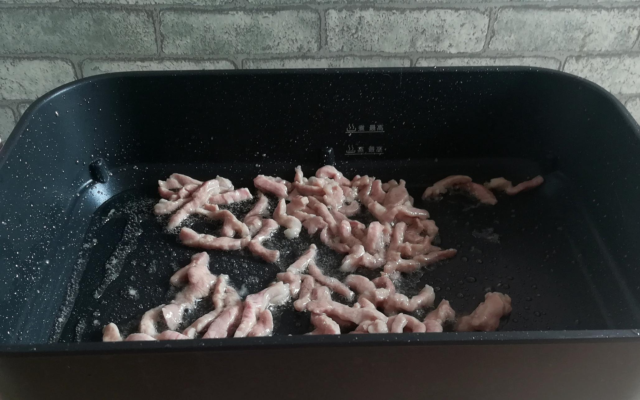 3.熱鍋放油,放入醃好的肉絲翻炒到斷生。