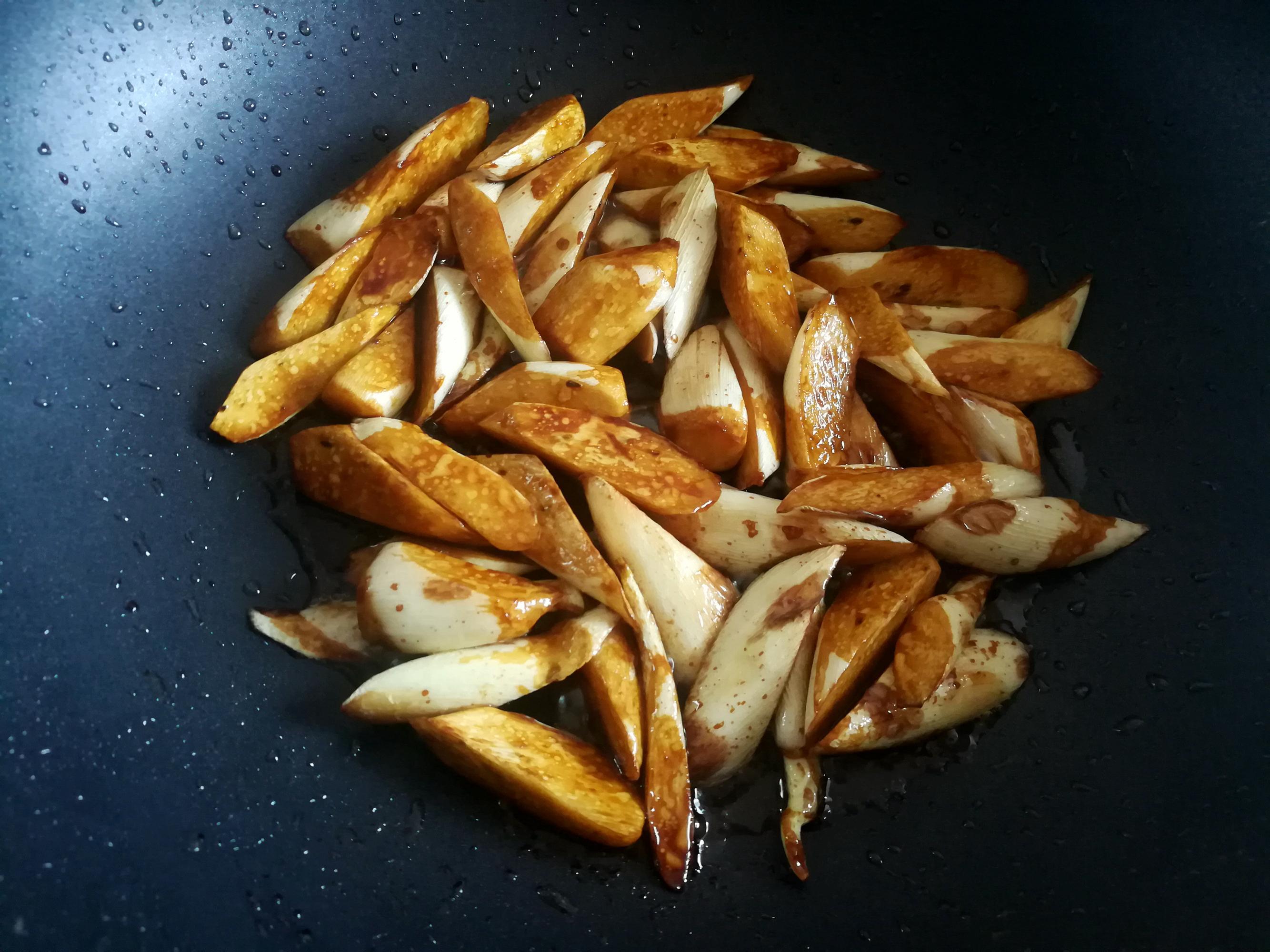 3.熱鍋放油,放入茭白翻炒到變軟,顏色有些微微焦黃。