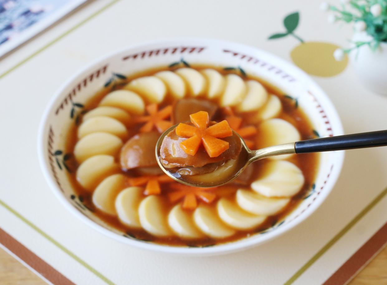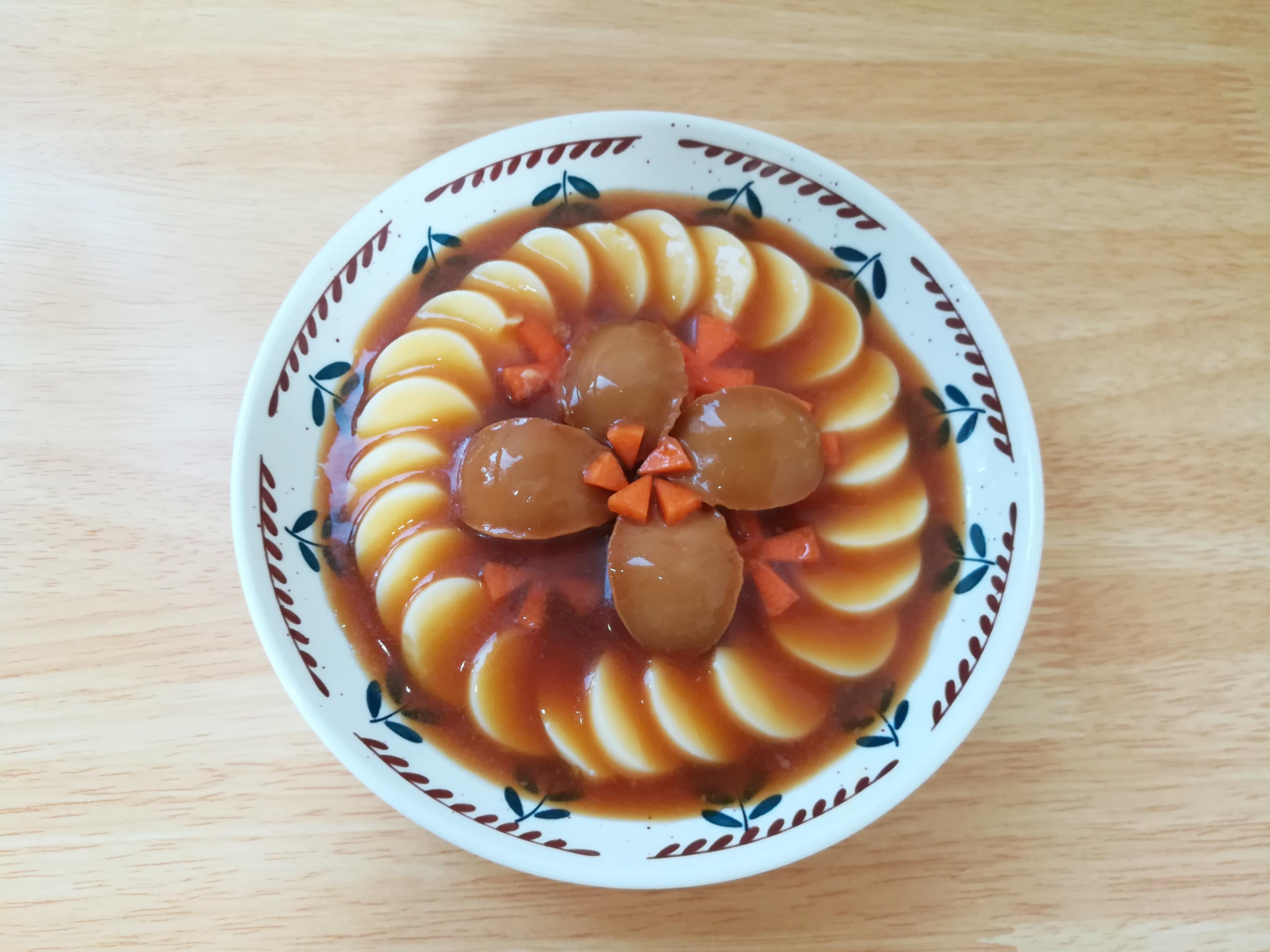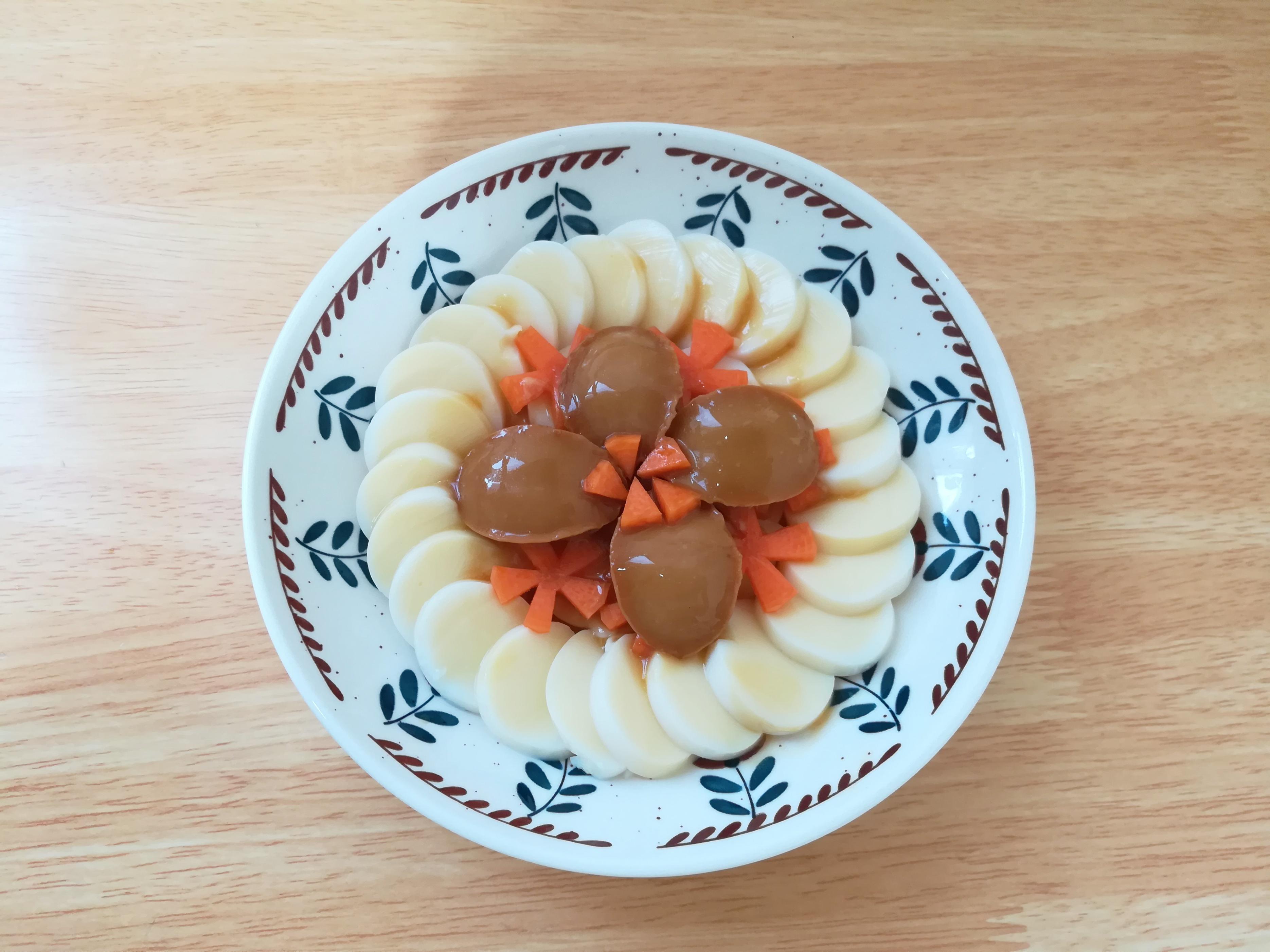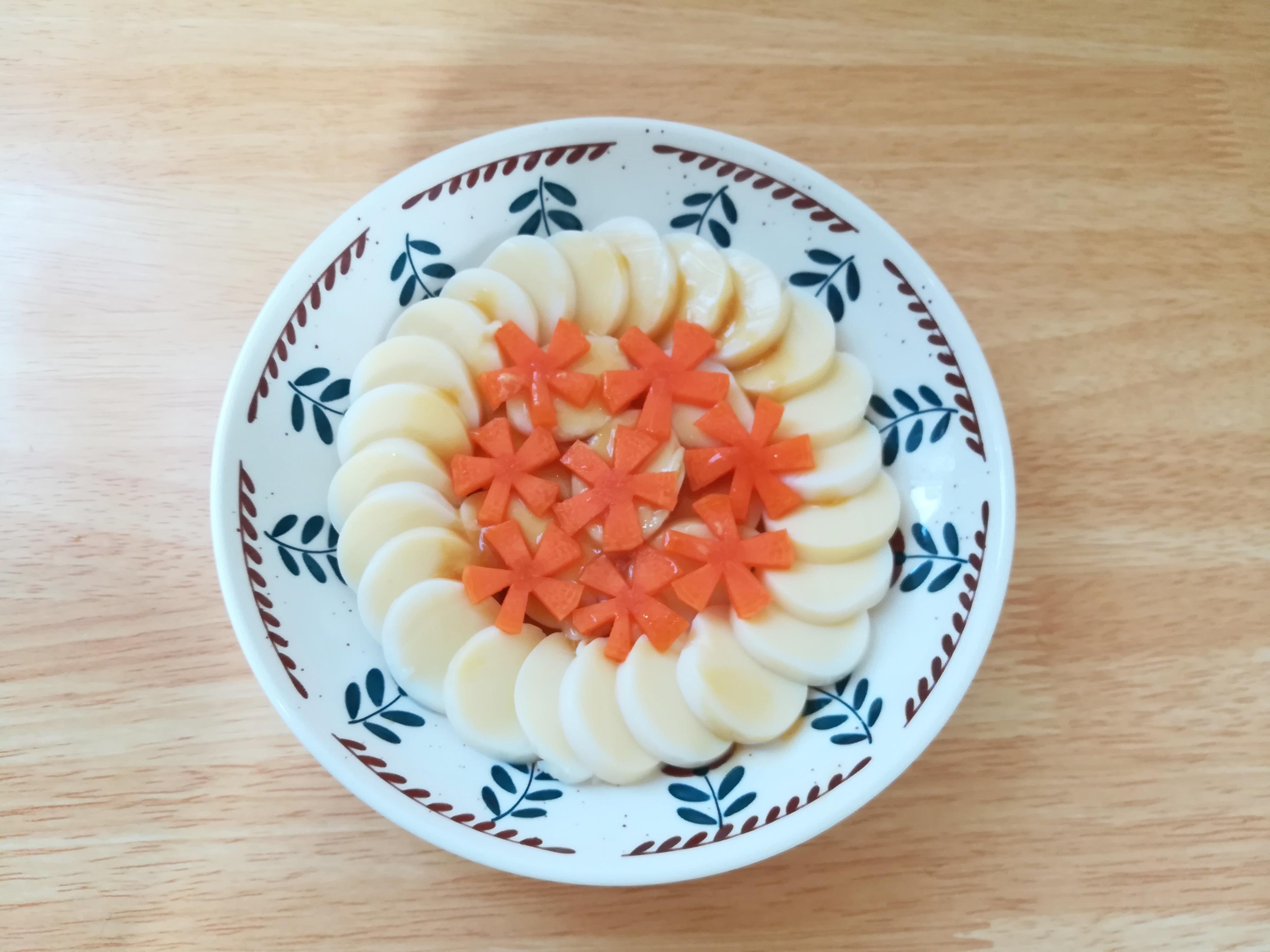 切好的胡蘿蔔花片放到圓環豆腐的中間位置。