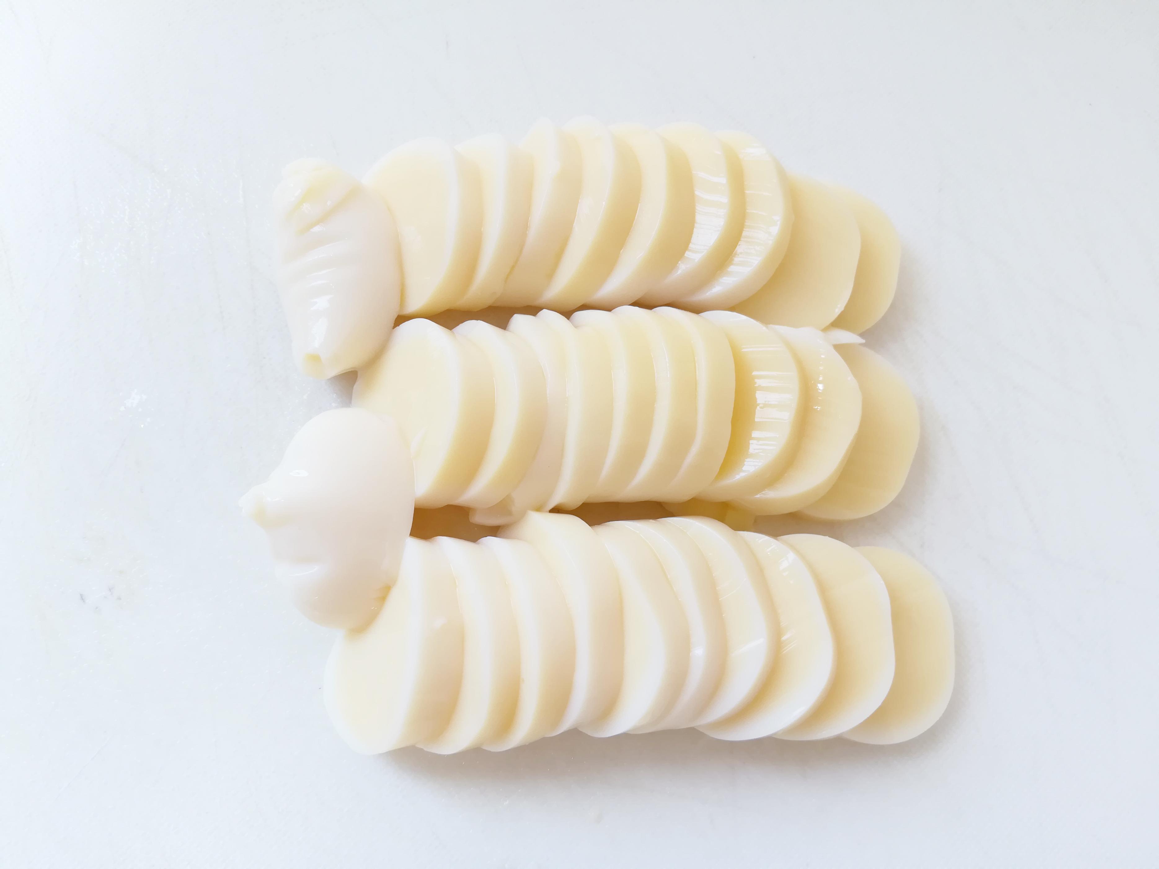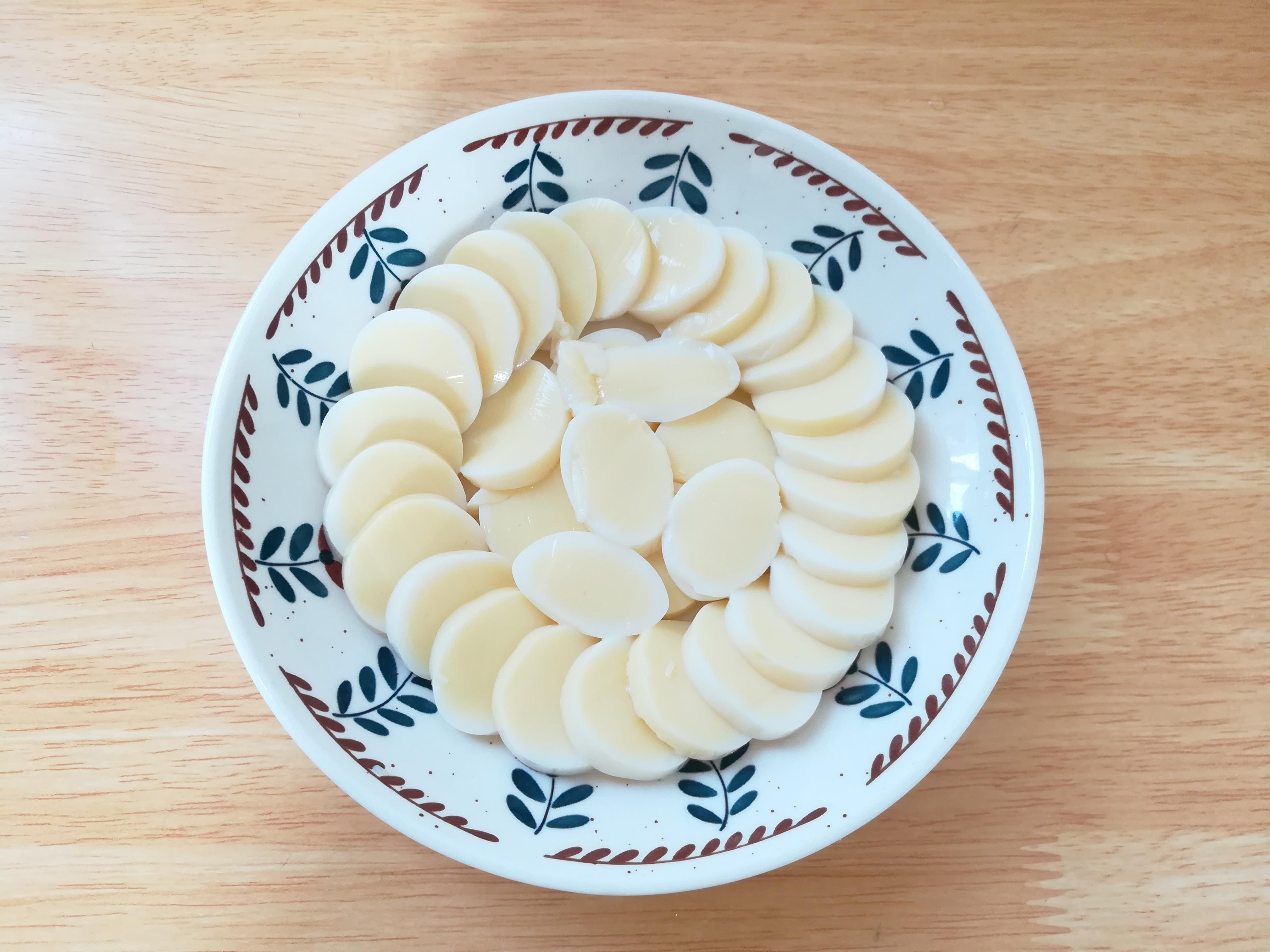 玉子豆腐去掉包裝,切成大約0.3釐米的薄片。