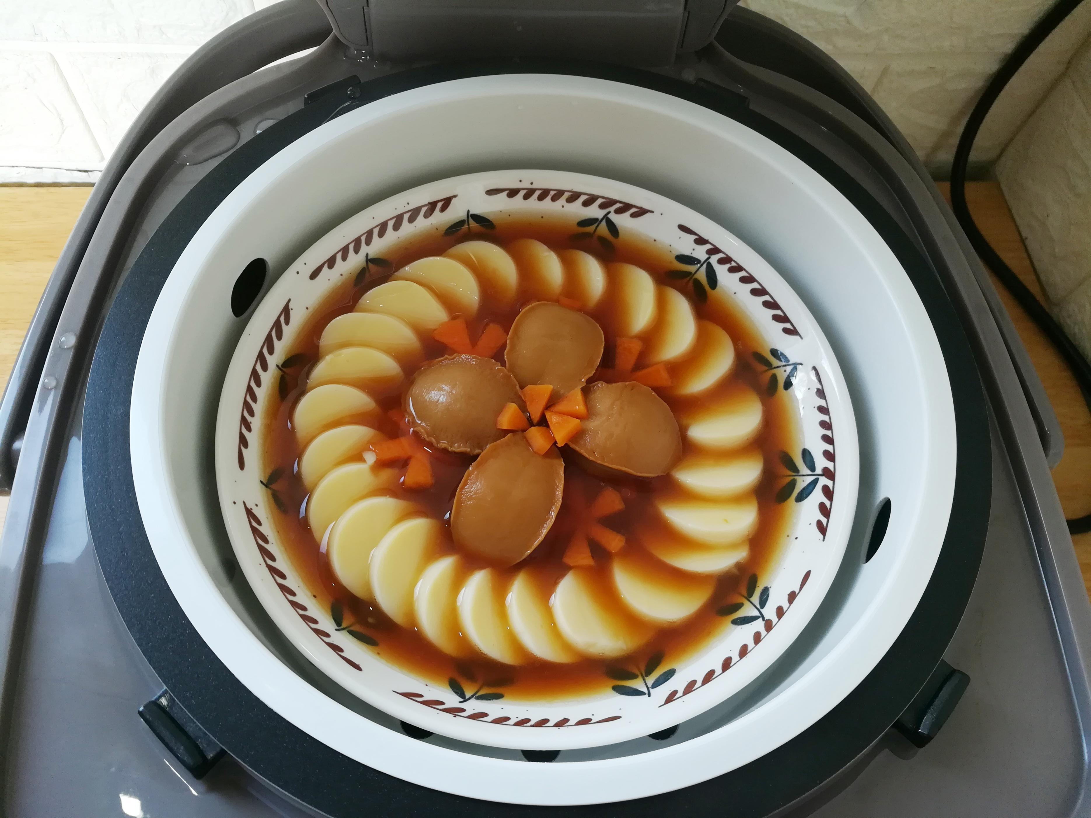 燒一鍋熱水或者是米飯快煮熟的時候,把裝有玉子豆腐和鮑魚盤子放到蒸籠裏,大火蒸6分鐘左右。