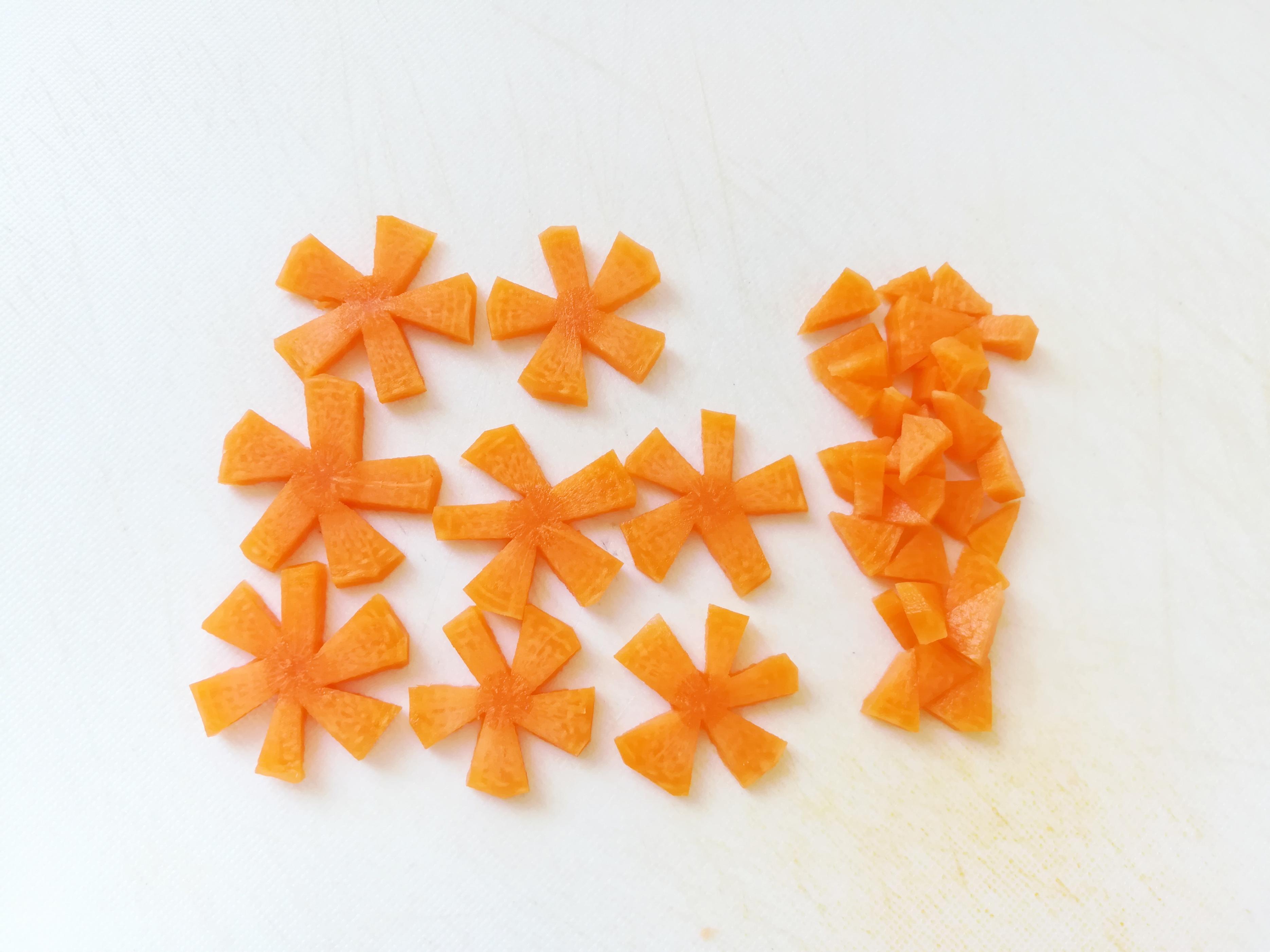 胡蘿蔔削掉外皮,切成薄片,用刀在胡蘿蔔片的邊緣切出5-6瓣的花型,切出切出來的小顆粒放一邊備用。