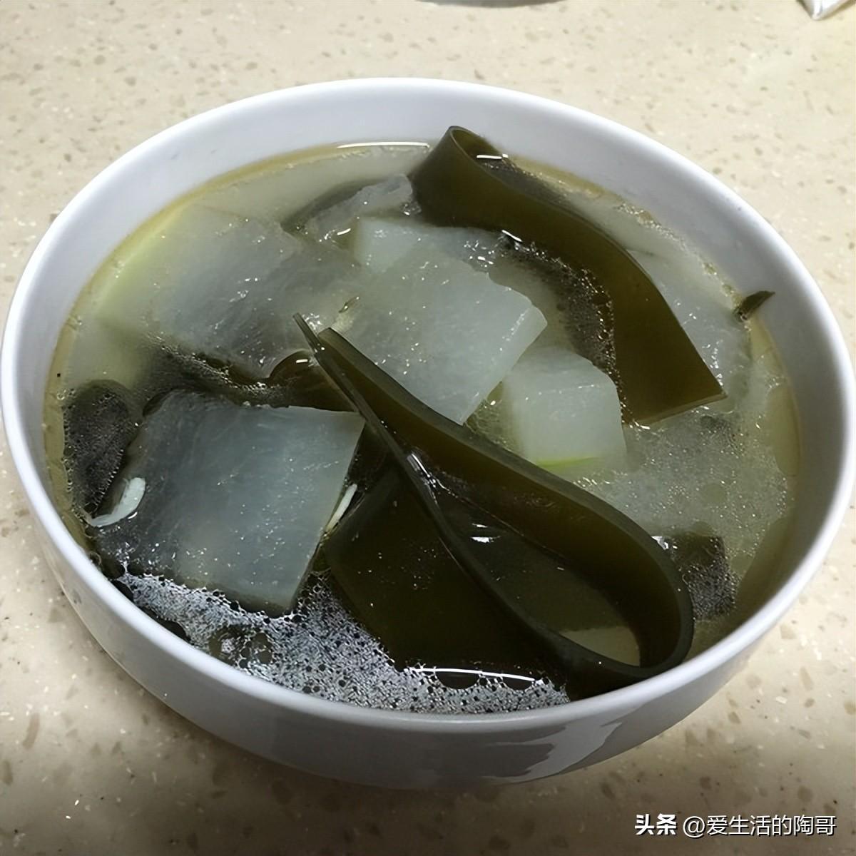食材:冬瓜1塊,海帶,蝦皮,鹽,胡椒粉, 香油,蔥,姜