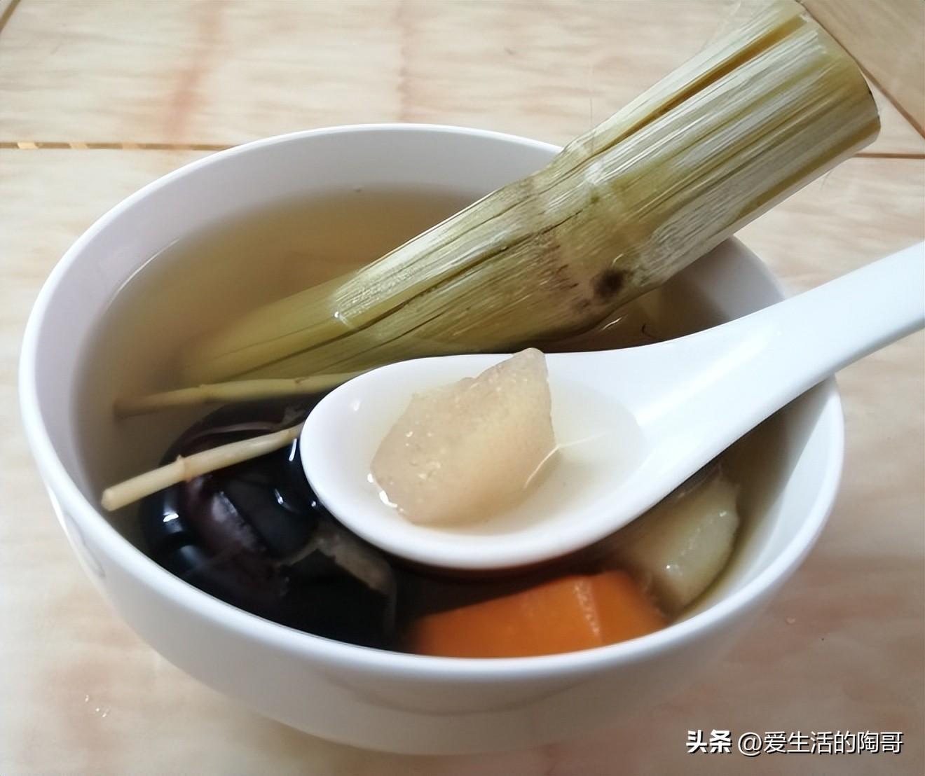 茅根竹蔗馬蹄水由白茅根、甘蔗和馬蹄(荸薺)等原料經過煮燉製成。幾種食材一起搭配,營養互補,是冬季一道養人湯。不僅可以清熱解毒、利尿消腫,還可以滋陰潤燥,治療嗓子疼痛,減輕炎症,咽喉腫痛等症狀有一定的緩解作用。