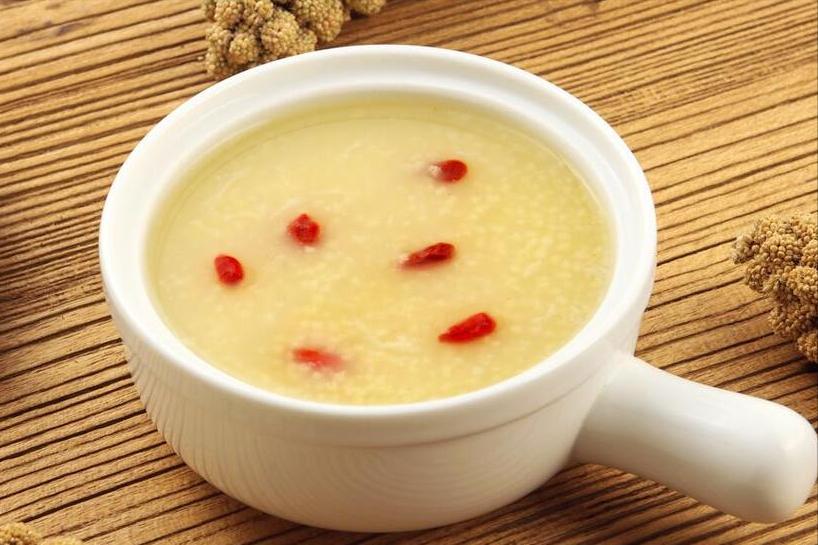 5、熬上1個小時左右,去看一下小米粥的狀態,如果喜歡喝湯多一點的,就可以關火了,如果喜歡喝稠一點的,那就繼續煮上10幾分鐘,煮好之後關火,把枸杞、冰糖倒進去,不喜歡不放也行,攪拌均勻以後,盛到碗裏開喝。