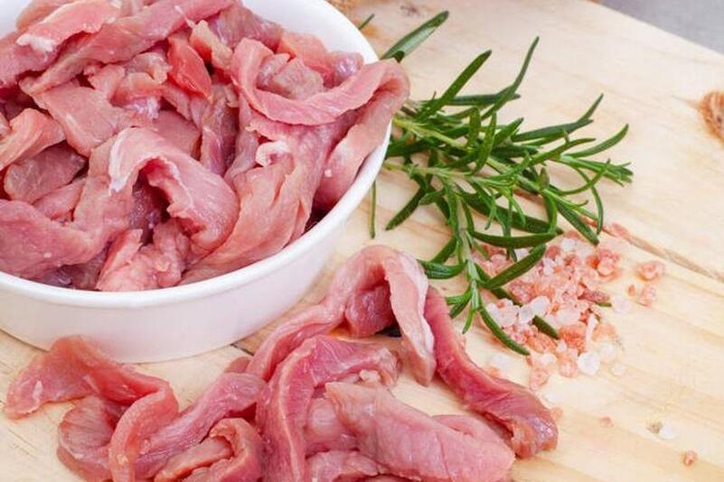 1、把裏脊肉上面的筋膜撕掉,然後放在水中清洗乾淨,洗淨後瀝乾水分,然後再把它放到案板上,切成條狀。