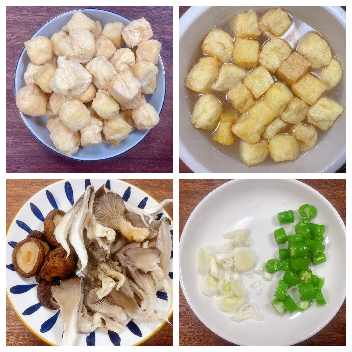 【油豆腐燉菌菇】 所裝備的食材有:油豆腐、香菇、平菇、線椒、大蔥、紅椒、鹽、蠔油、味極鮮、醬油、澱粉、生薑、食用油