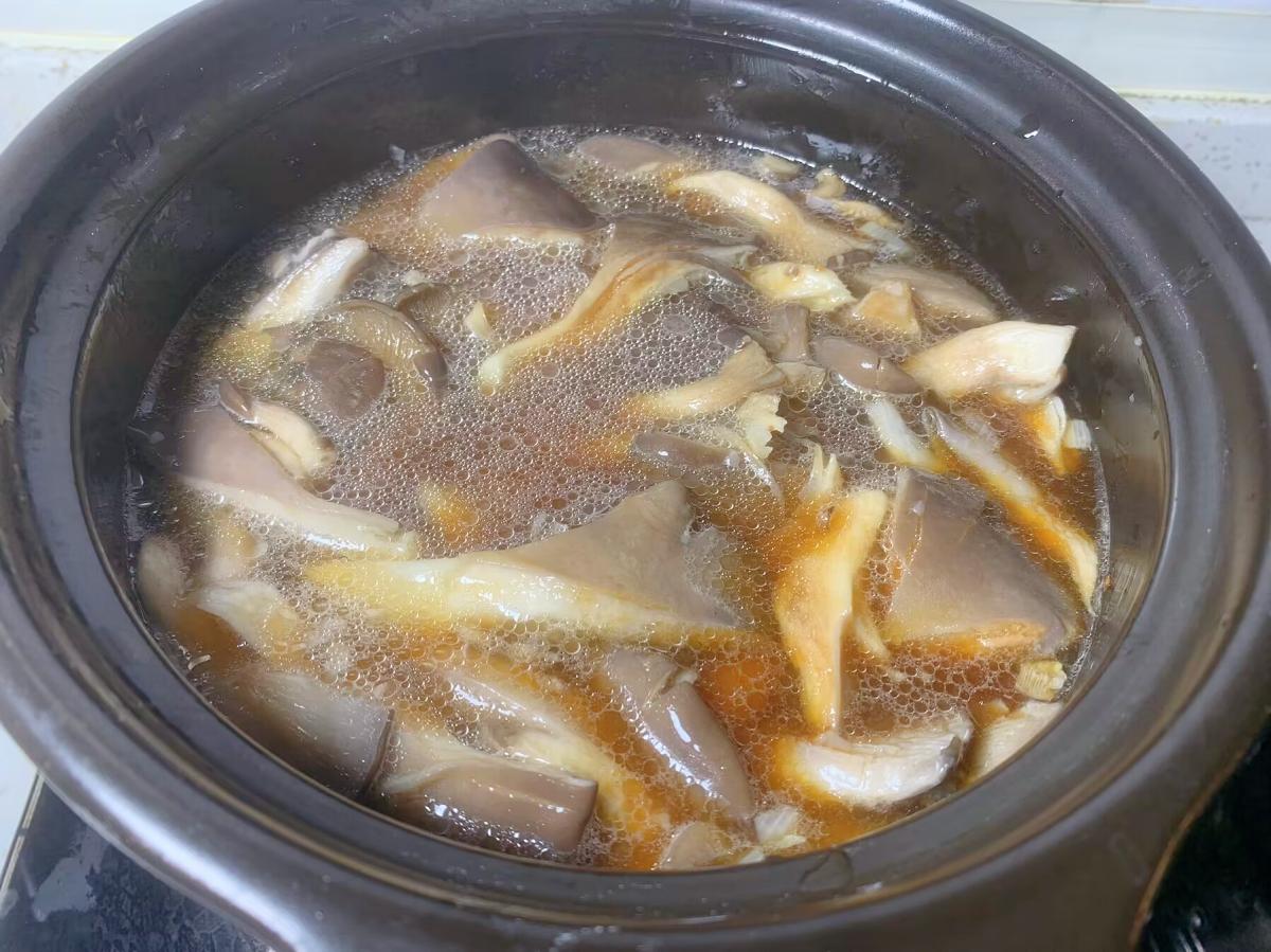 2、調一碗料汁,碗內倒入少許澱粉、2勺味極鮮、少許醬油、1勺蠔油、少許水和鹽,攪拌均勻淋入鍋中,再倒入適量清水,水量要沒過食材,中小火燉15分鐘。