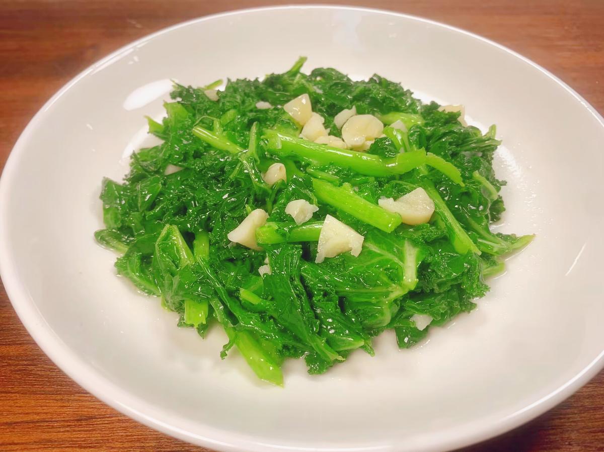 【熗炒羽衣甘藍】 所準備的食材有:羽衣甘藍、大蒜、雞精、鹽、蠔油、味極鮮、食用油