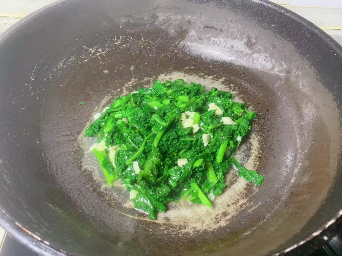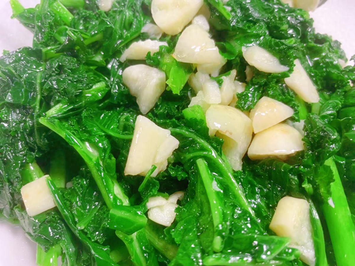 4、蒜粒炒好後倒入瀝乾水分的羽衣甘藍,快速翻炒,炒至蔬菜受熱均勻變軟,隨後往鍋中淋入少許味極鮮、適量蠔油、雞精和鹽,大火快速將水分炒幹,大概炒1分鐘左右,炒至軟爛翠綠即可關火。