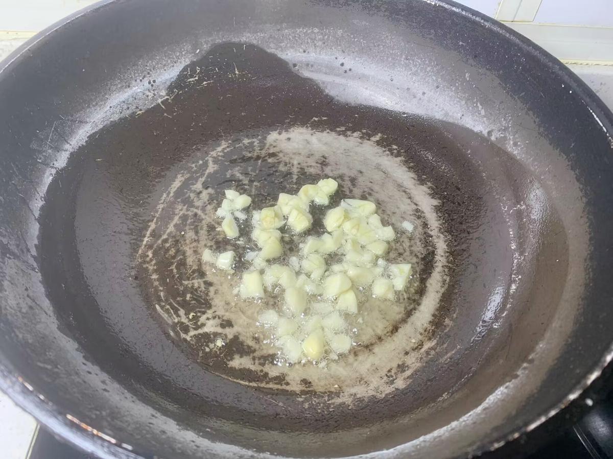 3、準備適量大蒜剝掉外皮,沖洗一下,切成蒜粒,大蒜和它可是絕配。鍋中倒入少許食用油,油溫燒熱後放入蒜粒,炒至微黃散發出蒜香味,火候不要太大,不然大蒜炒糊,口感會很差。
