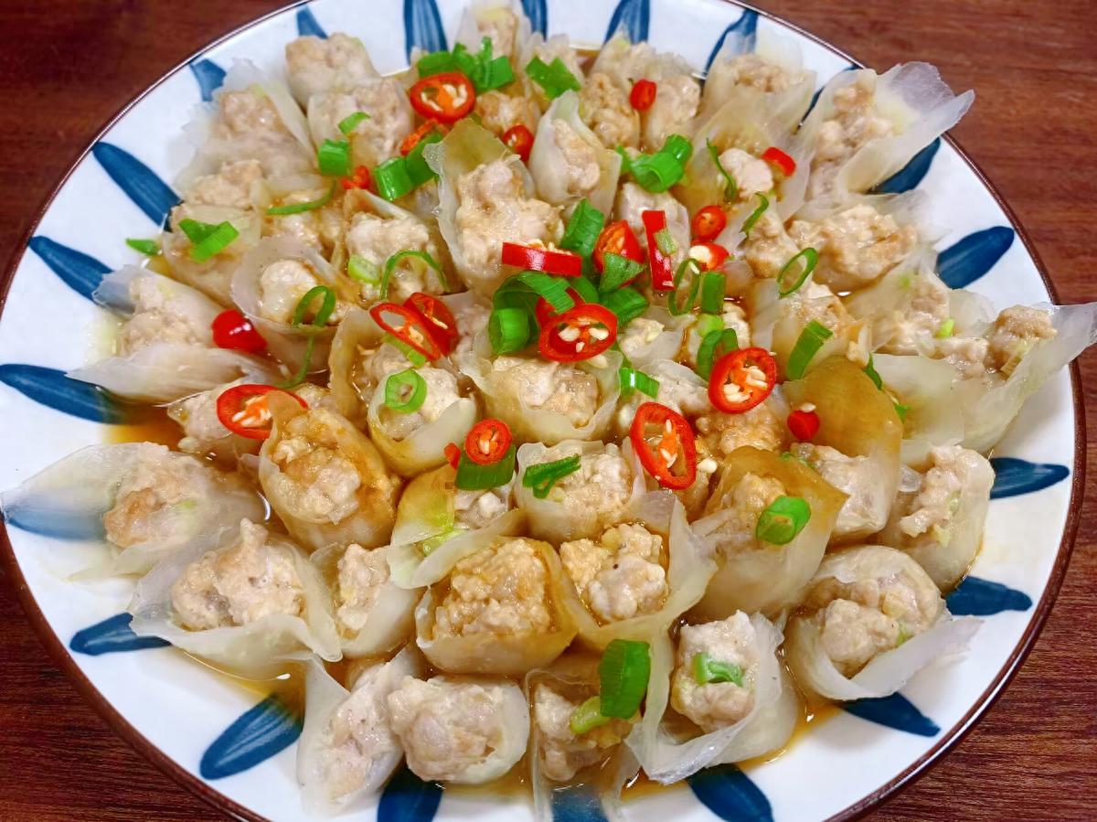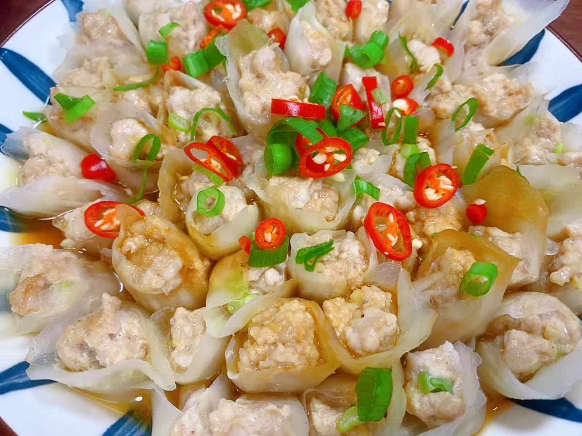 1、切好的白菜片一定要用開水煮一下,不然直接裹肉餡蒸熟後就不成型了。