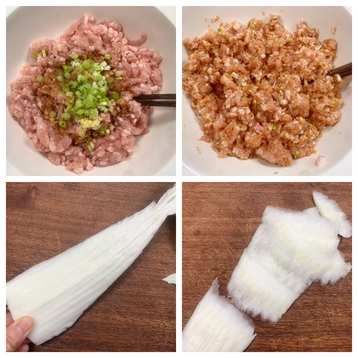 具體做法:1、首先準備一斤瘦一些的豬肉餡,放入剁碎的蔥姜、少許老抽、1勺料酒、2勺生抽、1勺蠔油、小半勺香油,充分攪拌均勻,醃10分鐘,讓肉餡喫起來更入味。接下來再準備幾塊大白菜梗,去掉葉子,斜刀切成越薄越好的薄片,如上圖所示,切好的白菜片放入鍋中煮一下,這樣容易裹肉餡。取一塊白菜片,放入適量肉餡,把它從一頭捲起來,卷好後整齊地擺放在盤內。