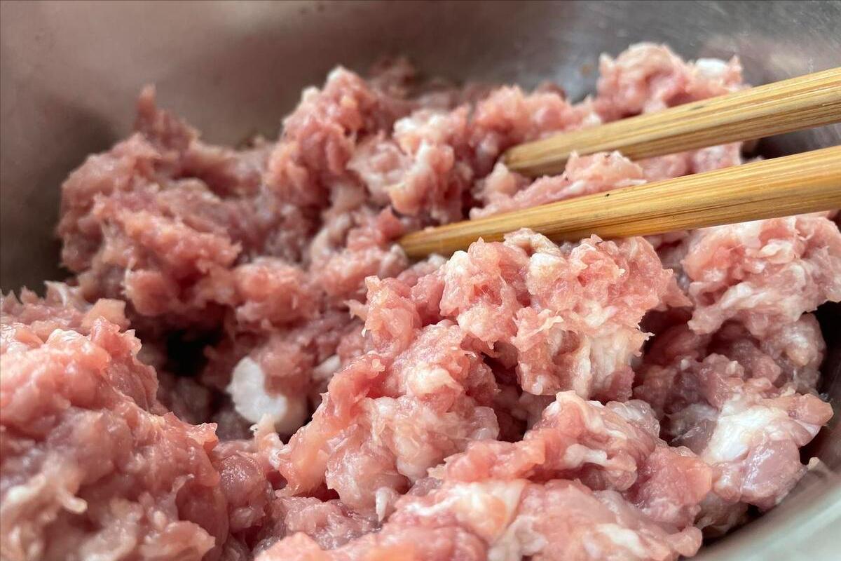 2、絞碎後不要着急取出來,我們把花椒水直接倒進去,然後繼續攪拌一會兒,這樣可以起到去腥的效果,讓肉餡更多汁。用絞肉機攪打的話,肯定比用手攪拌更透徹,而且還能偷會兒懶。