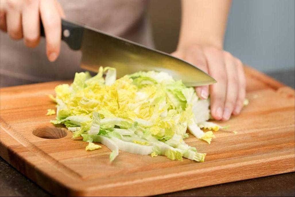 4、之後將白菜清洗一下,每一片葉子都要清洗到位,不然很容易出現小蟲卵,洗淨後瀝乾水分,放到案板上切碎。切碎後,直接調餡兒的話會出水,用鹽殺水之後,味道不行,很乾巴。
