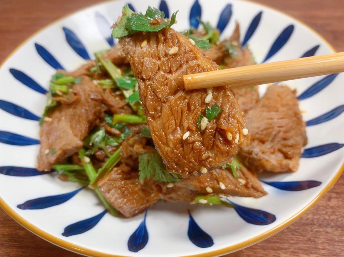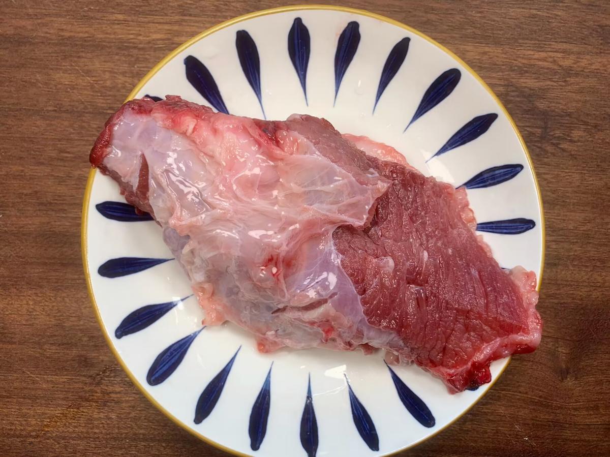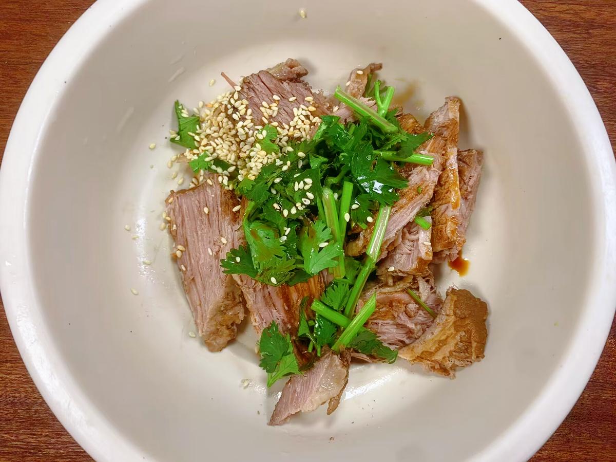 5、把牛肉上的保鮮膜撕下來,順着紋路切成牛肉片,可以直接喫,也可以加一些香菜段、白芝麻、蠔油、味極鮮拌一下,風味獨特。
