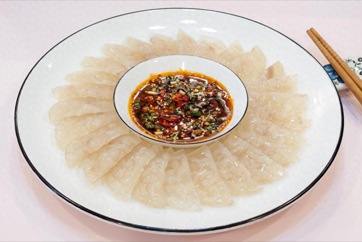脫模之後的豬皮凍,直接放到案板上,切成塊狀就可以啦,切好後盛在盤子裏,晶瑩剔透的,看着真誘人。最後再來做個料汁,簡單蘸着喫,就可以啦。