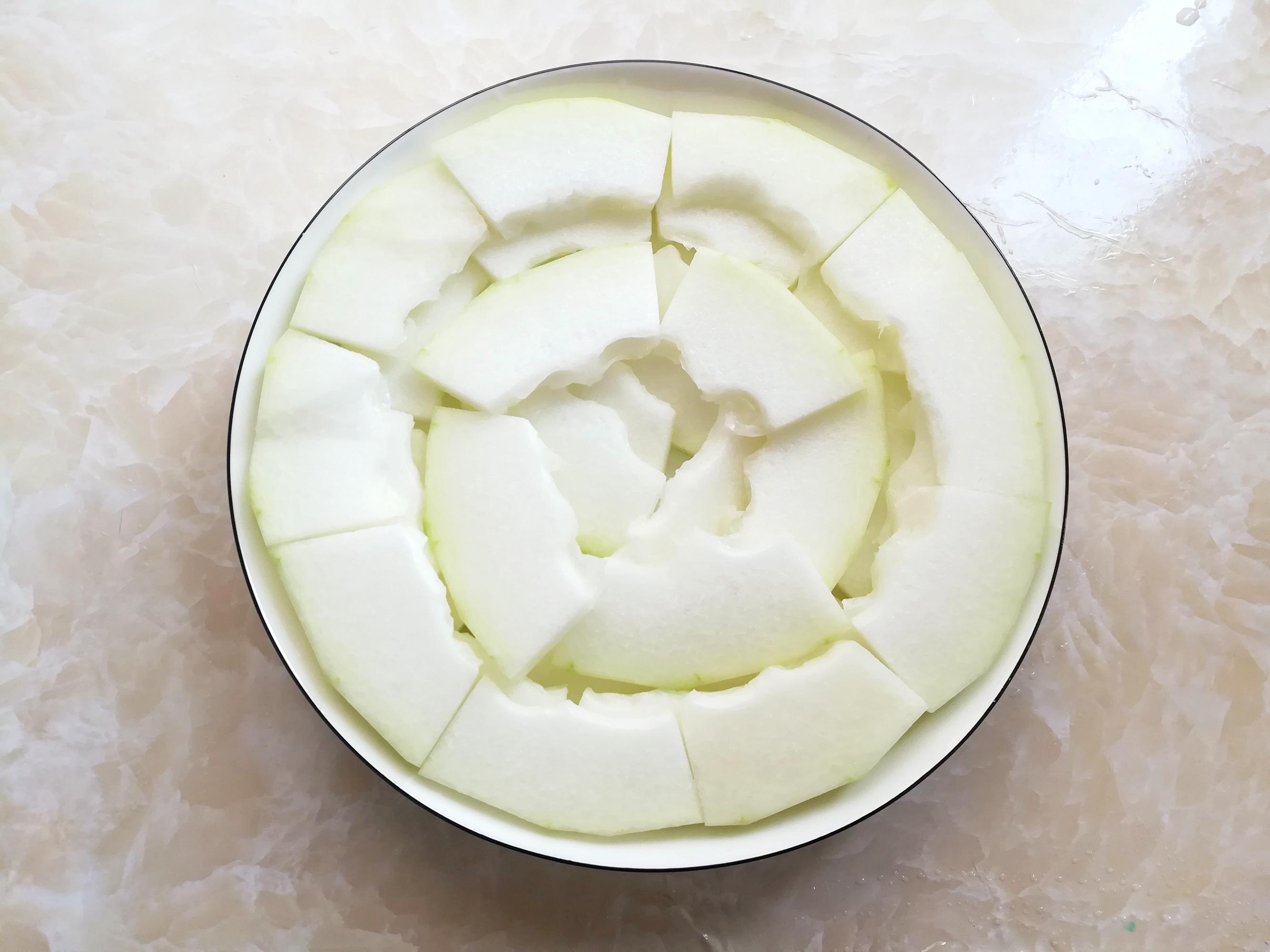 做法:1.冬瓜削掉外皮,切成薄片,擺到盤子裏,圍成圓環形,多餘的冬瓜皮放到盤子中間。