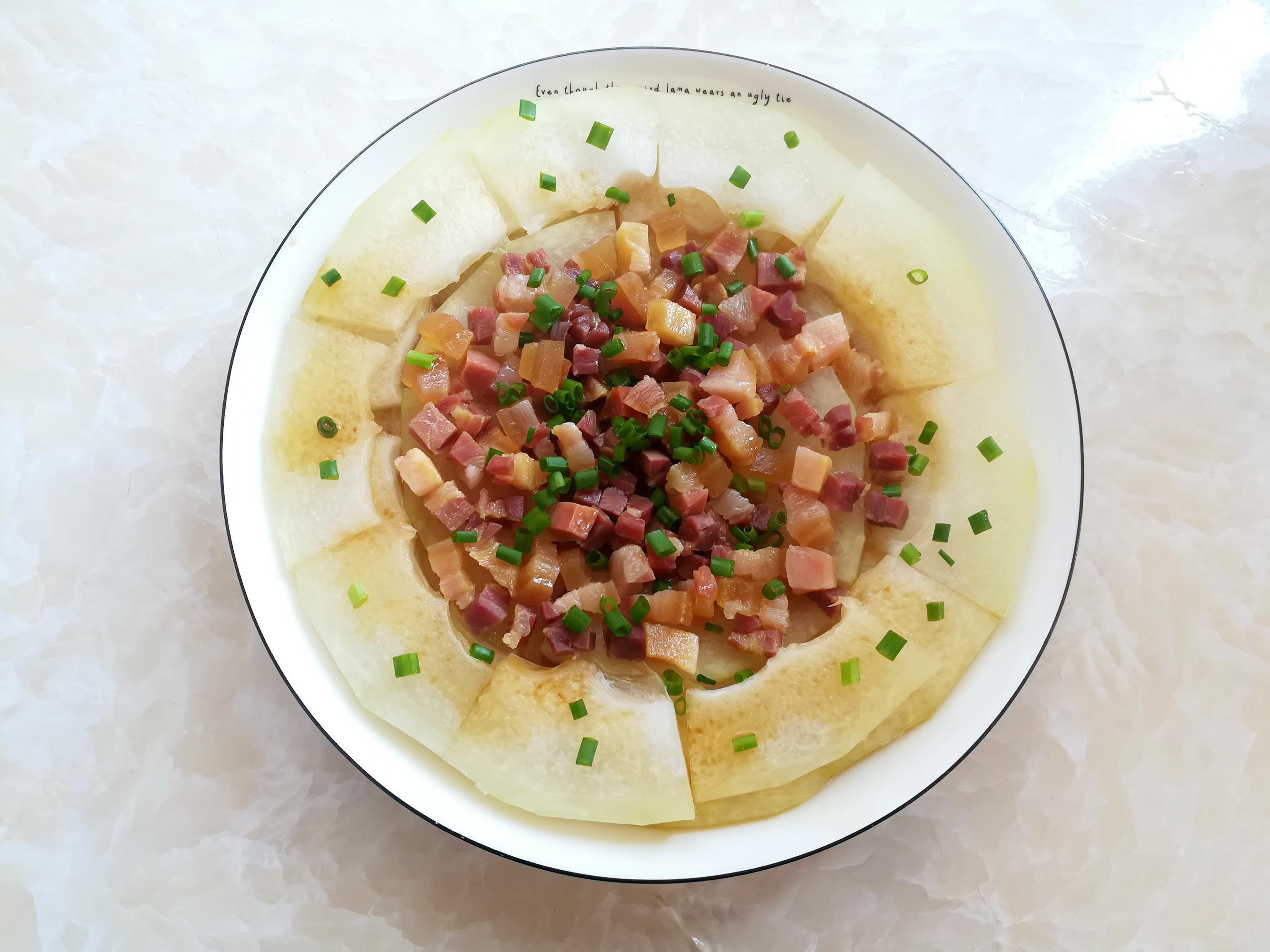 4.蒸好的冬瓜取出來,把湯汁倒進小碗裏,加生抽調味再淋到冬瓜上,撒上香蔥即可。