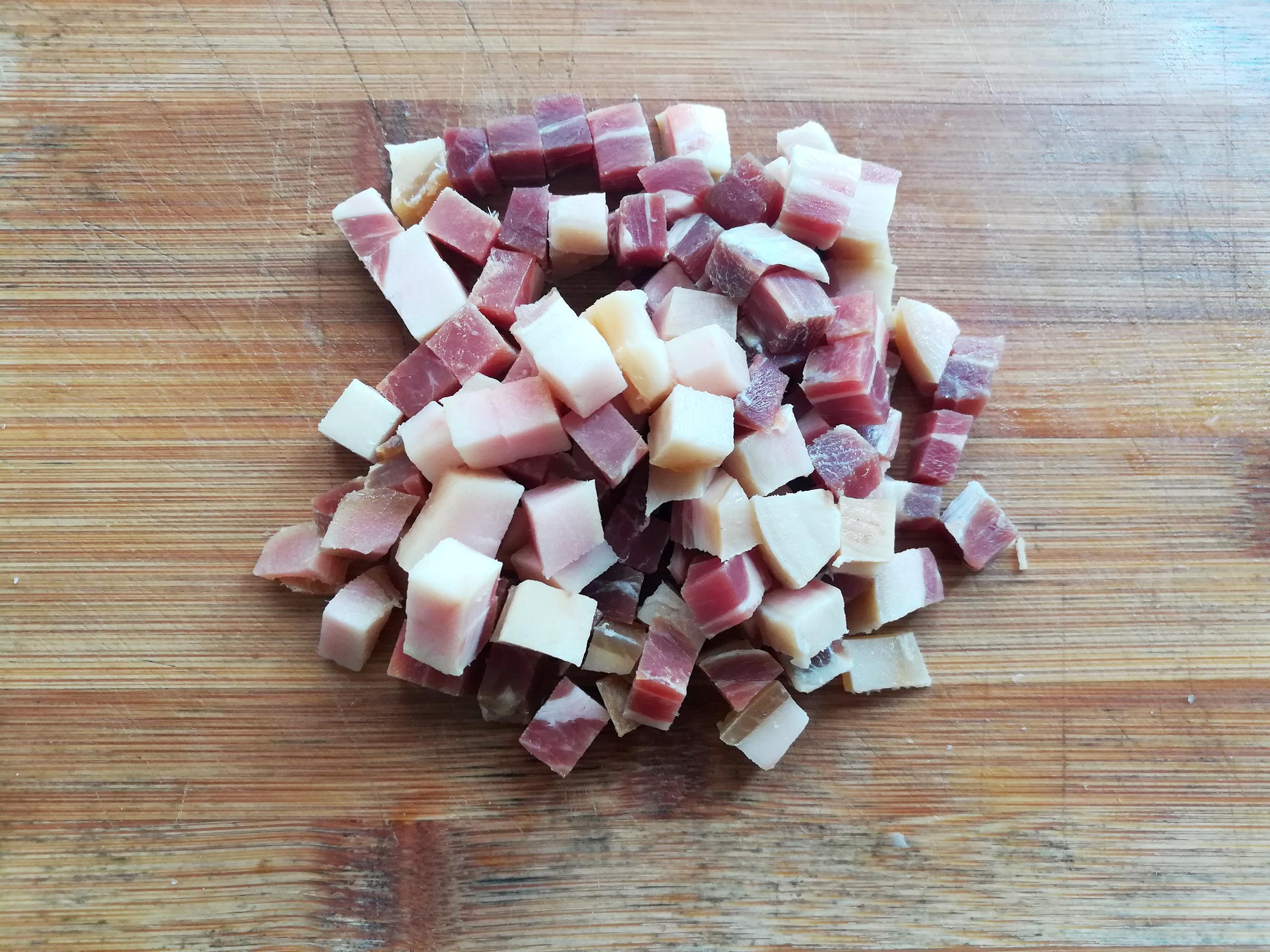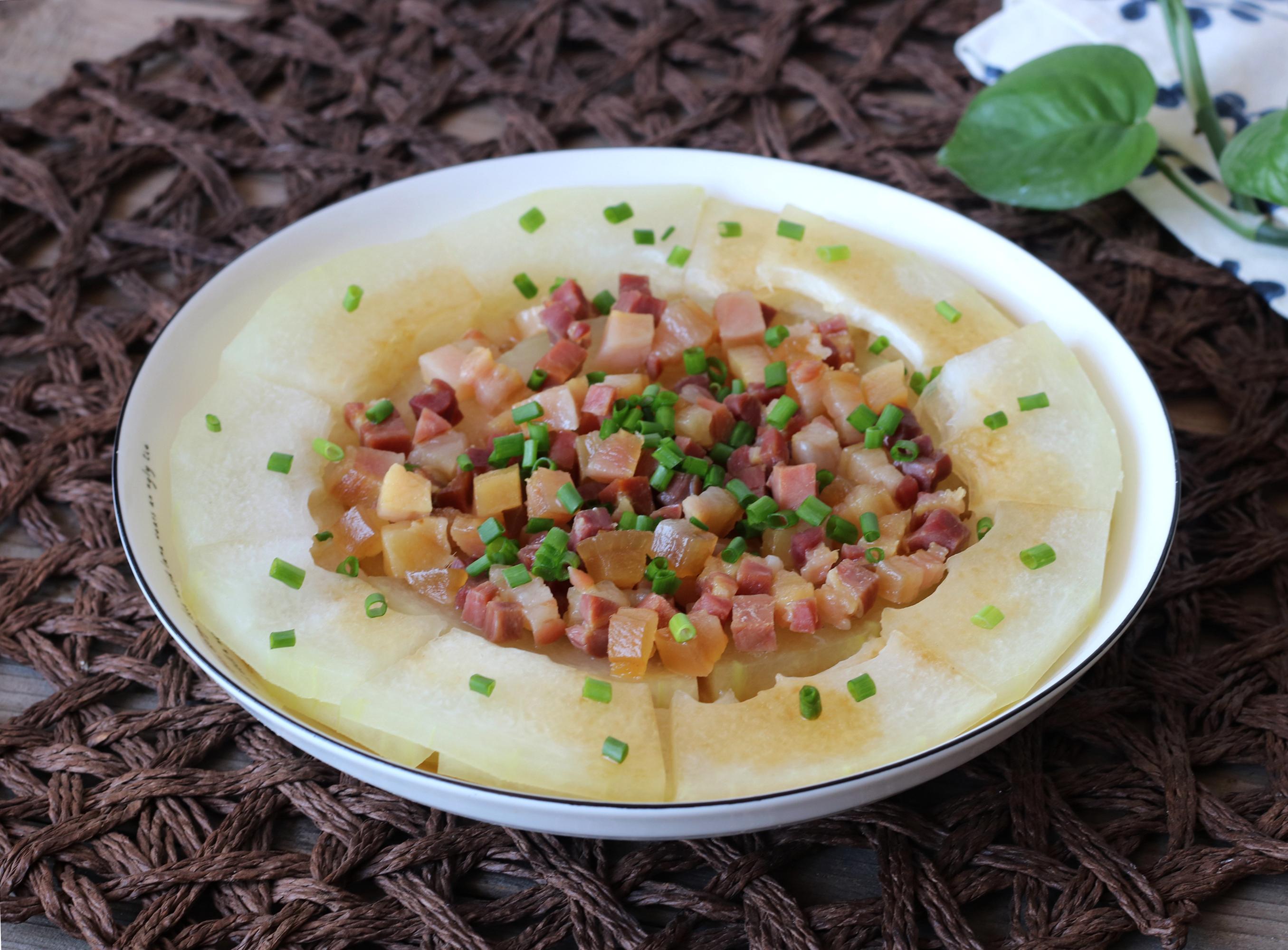 2.火腿肉簡單清洗一下,切成玉米粒大小的肉丁,放到裝有冬瓜的盤子中間,香蔥只要葉子部分切成顆粒。火腿肉可以換成臘肉或者臘腸。