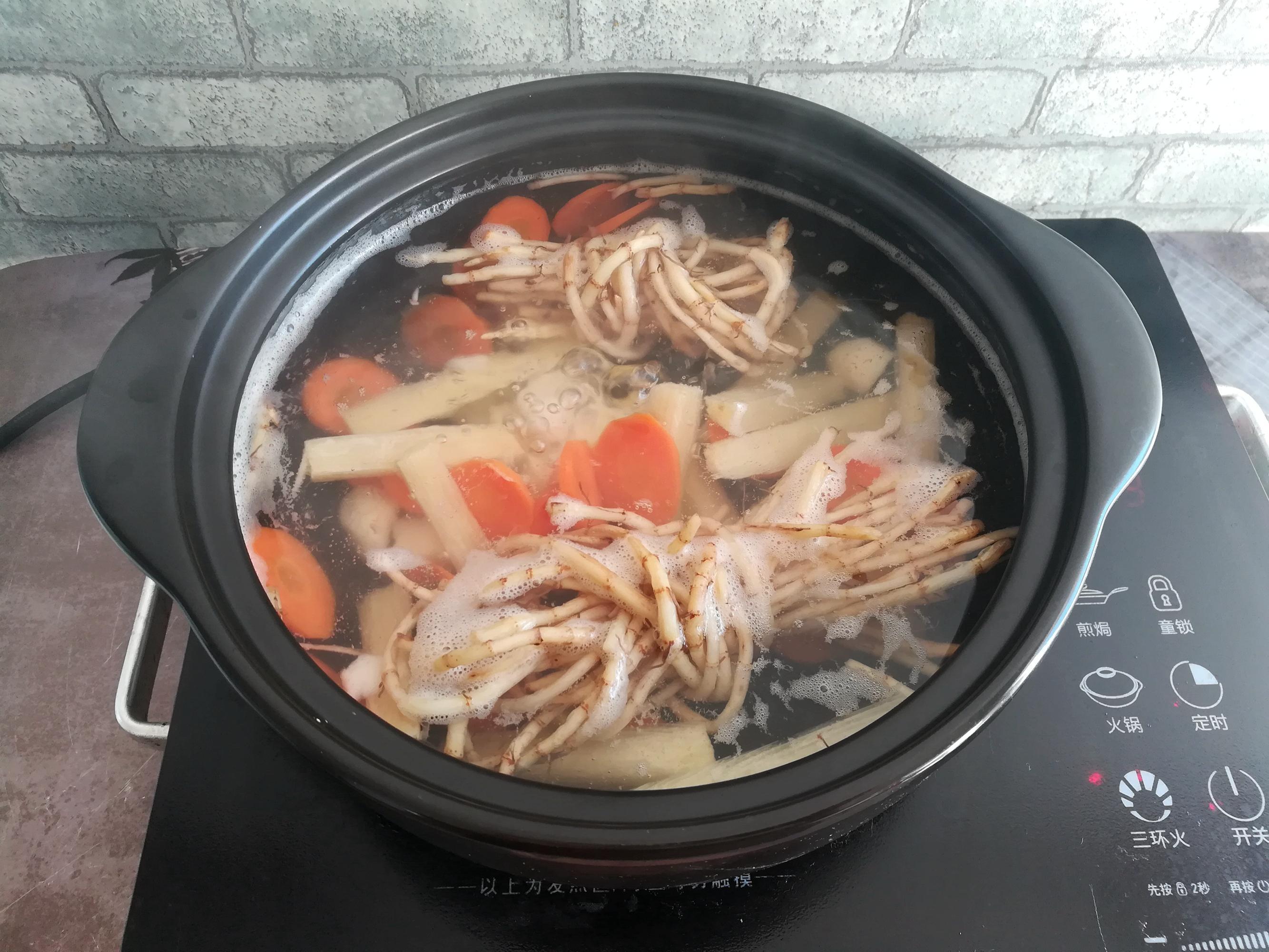 2.馬蹄、甘蔗、胡蘿蔔和魚腥草一起放入砂鍋中,加入足量的水,大火煮開再煮10分鐘,把煮軟的魚腥草撈出來,加碎冰糖調味,過濾出雜質。