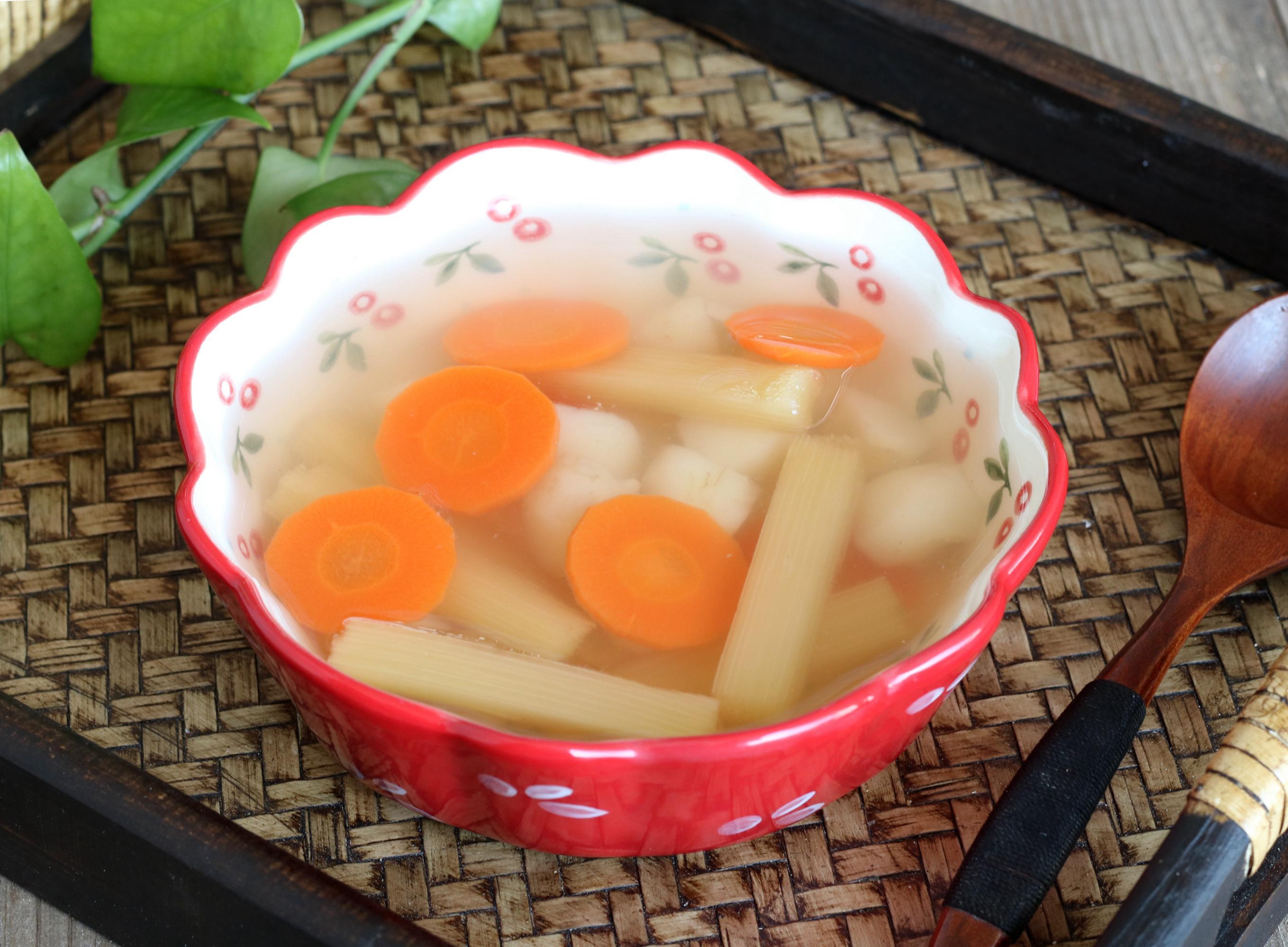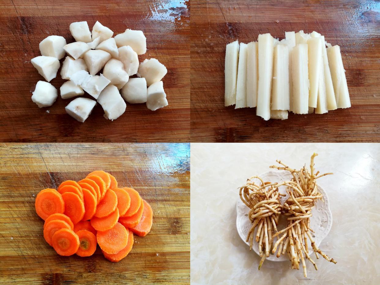 做法:1.馬蹄削皮切成小塊,甘蔗切成細條,胡蘿蔔去皮切圓片,魚腥草清洗乾淨,紮成小捆。